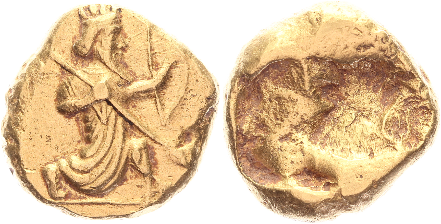 AV Daric [8,35 gm, 16,1 mm]. Persian king or hero in kneeling-running position right, holding spear and bow; quiver over shoulder / Rectangular incuse punch. Carradice Type IIIb A/B. Fine Style. gVF.Purchased from F. Javorṡeck, Febuary (The Hague Holland Coin Fair)