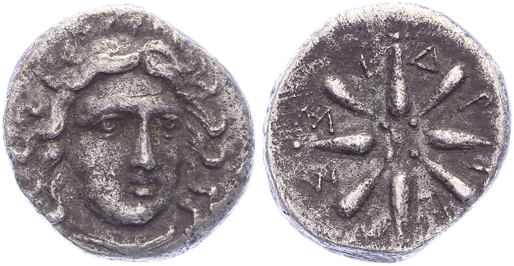 351-341 BC. AR Trihemiobol [0,77 gm, 9 mm]. Halikarnassos mint. Laureate head of Apollo facing slightly right, drapery around neck / Starlike floral pattern. SNG Keckman 279; SNG Kayhan 887. Toned VF.Purchased from Tom Vossen, September 2017