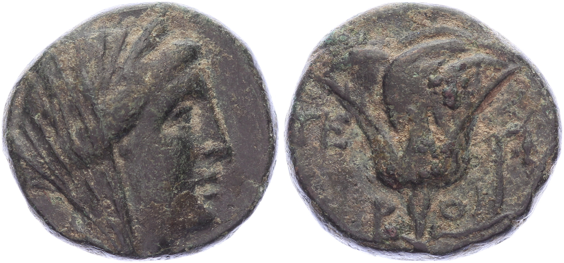 Rhodes. Circa 229-226 BC. Æ Dichalkon [2,62 gm, 13,7 mm]. Veiled female head (of Berenike II?) to right / Rose with two buds; tot he left. TE Ashton, Rhodian Bronze Coinage and the Earthquake of 229-226 BC in NC 1986. 11 (same dies). Rare and interesting. VF.