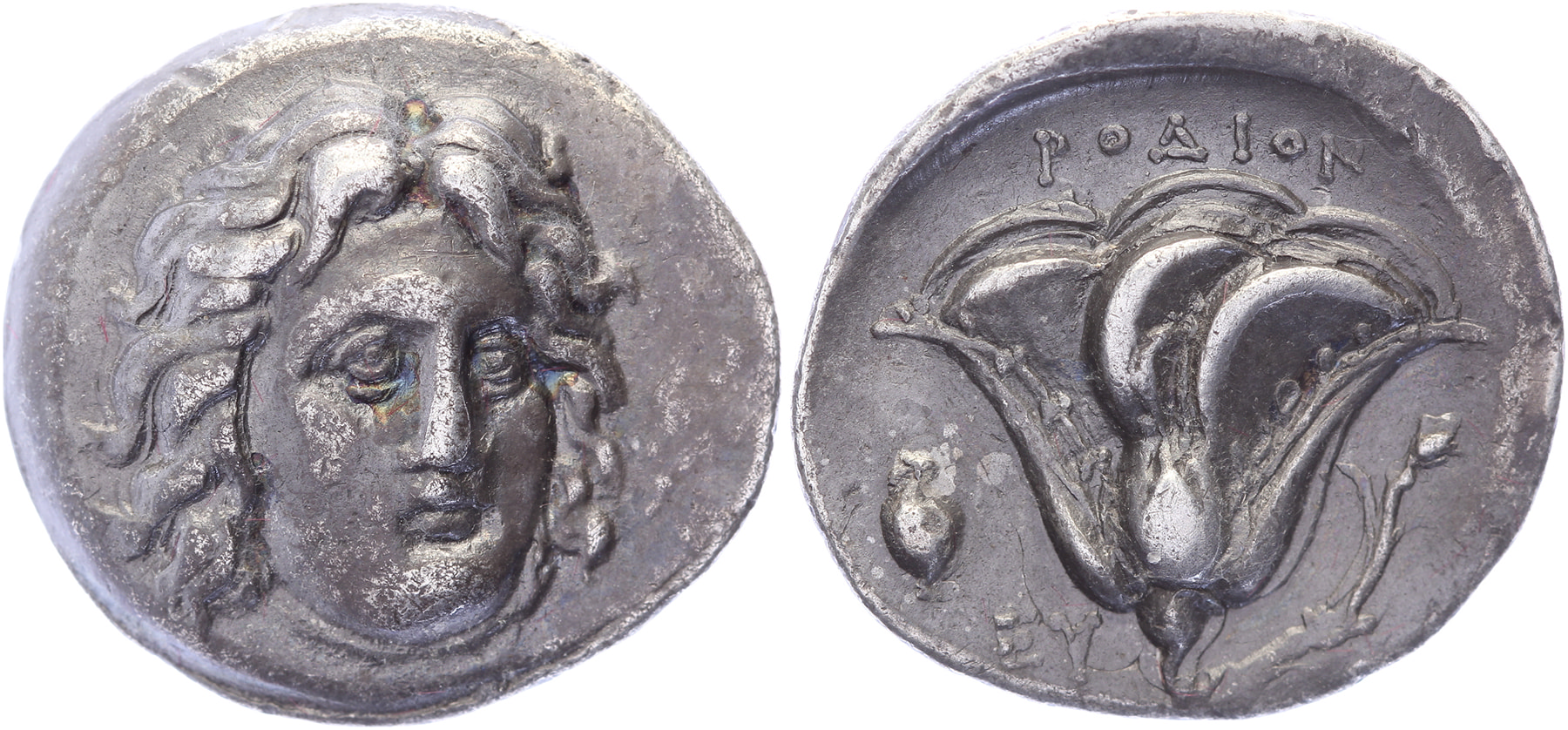 Circa 305-275 BC. AR Didrachm [6,61 gm, 22,1 mm]. Head of Helios facing slightly right / POΔION, rose with bud to right; to left, jug above EY. Ashton 160; Ashton, Colossus, Series 2; SNG Keckman 461; SNG Copenhagen 730. Toned VF.
