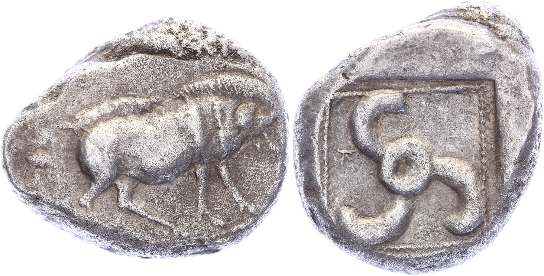 Kha…Circa 480-460 BC. AR Stater [8,41 gm, 19,9 mm]. Boar walking right / Triskeles within incuse square. Cf. Müseler III.58 (triskeles ending in heads of rooster, same dynast). Unpublished. VF.Purchased from Tom Vossen, March 2004