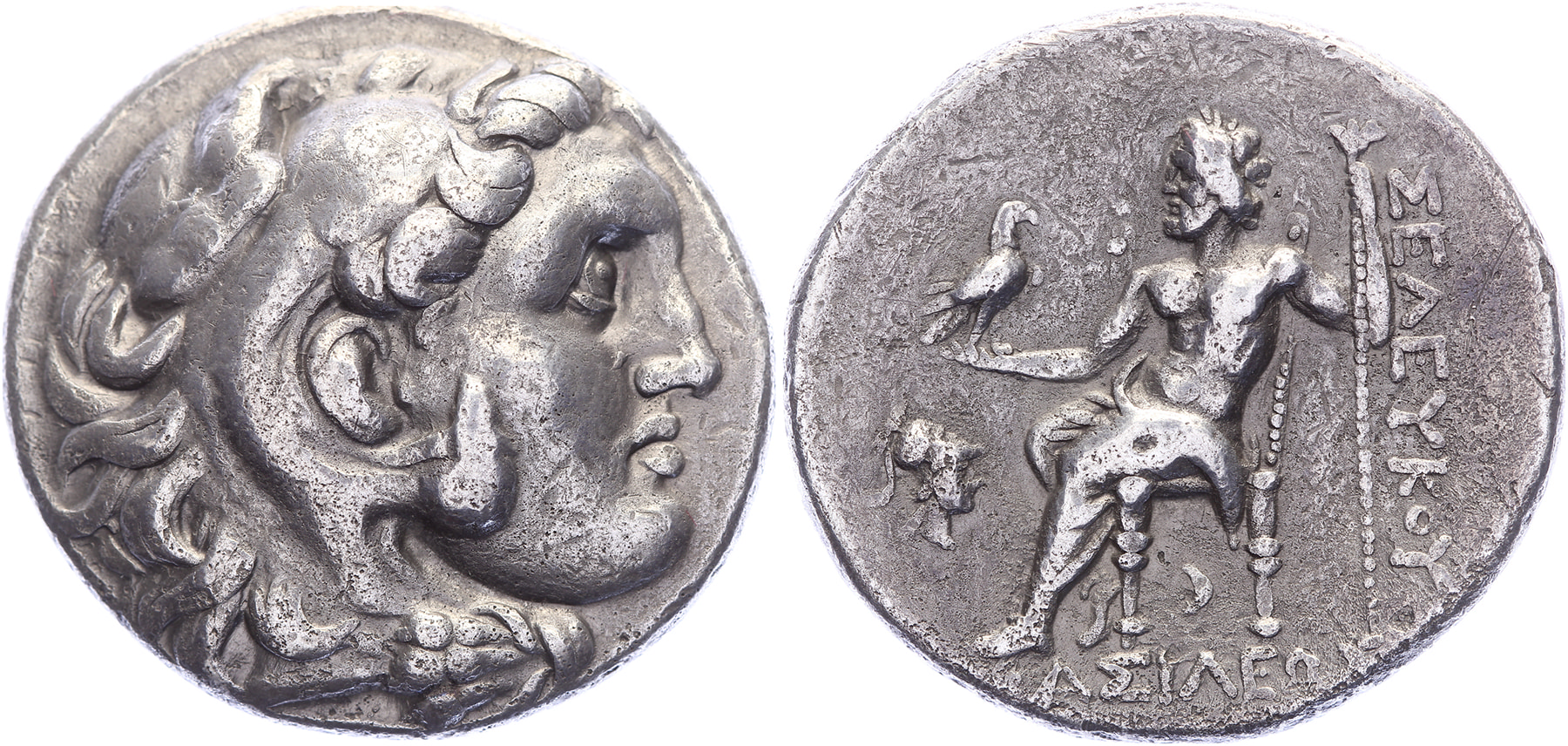 AR Tetradrachm [17,05 gm, 28 mm]. Pergamon mint. Struck under Philetairos. Head of Heracles right, wearing lion skin / ΒAΣIΛEΩΣ - ΣΕΛΕΥΚΟΥ, Zeus Aëtophoros seated left; in field left, helmeted head of Athena, under throne crescent. Newell WSM 1533; SC 308. VF.Purchased from E. Datema, September 2021 (Berkel Enschot coin fair)