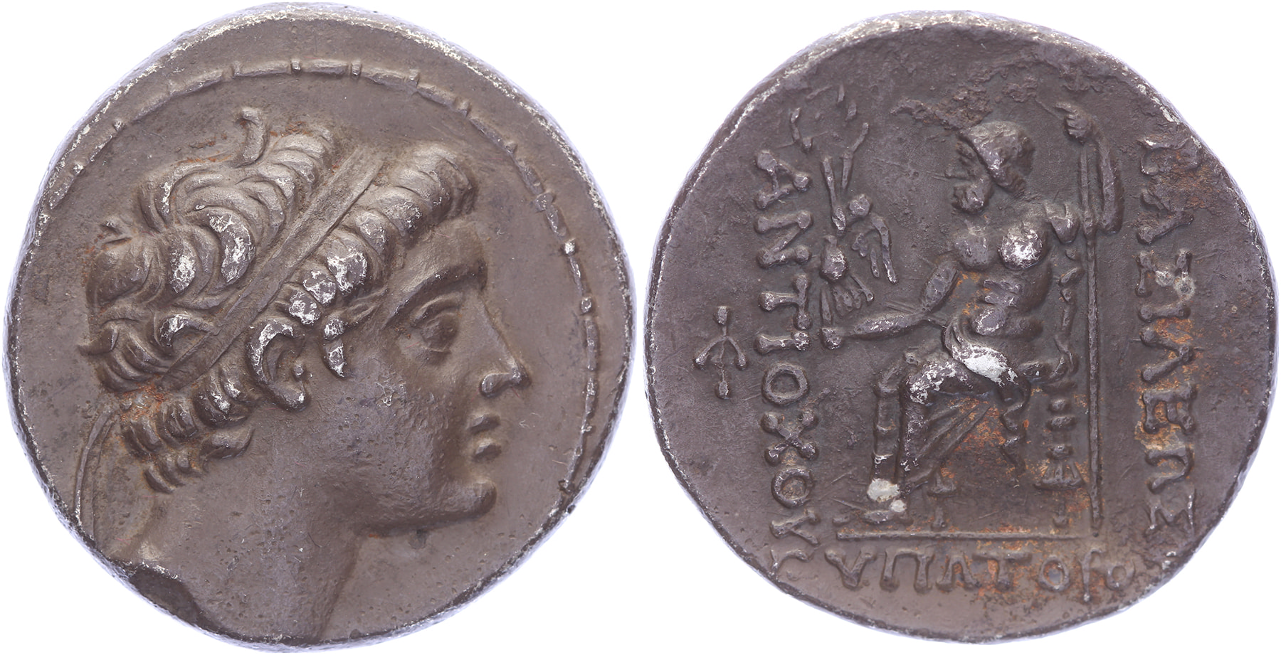 AR Tetradrachm [15,85 gm, 27,8 mm]. Antioch on the Orontes mint. Struck 164-162 BC. Diademed head to right / BAΣIΛEΩΣ ANTIOXOY EYΠATOPOΣ, Zeus Nikephoros seated to left, holding sceptre; monogram in outer left field. SC 1575.1; HGC 9, 752. Darkly toned, gVF.
