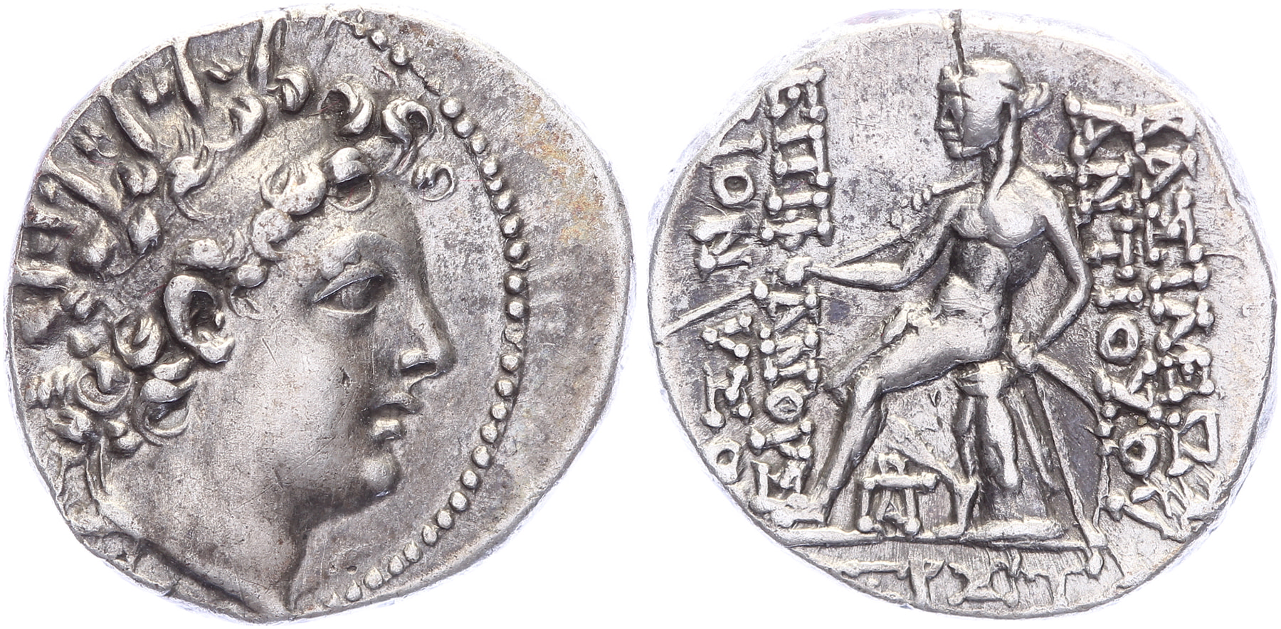 AR Drachm [4,17 gm, 16,9 mm]. Antioch on the Orontes mint. Dated SE 169 (144/3 BC). Radiate and diademed head right / ΒΑΣΙΛΕΩΣ / ANTIOXOY - ΕΠΙΦΑΝΟΥΣ / ΔΙΟΝΥΣΟ[Υ] / [Θ]ΞΡ ΣΤΑ, Apollo seated left on omphalos, holding arrow in right hand and bow in left; on inner left, monogram. SC 2002.1d; Newell, SMA 236. Smal flan crack, aEF.Purchased from Tom Vossen, September 2017 (#13186)
