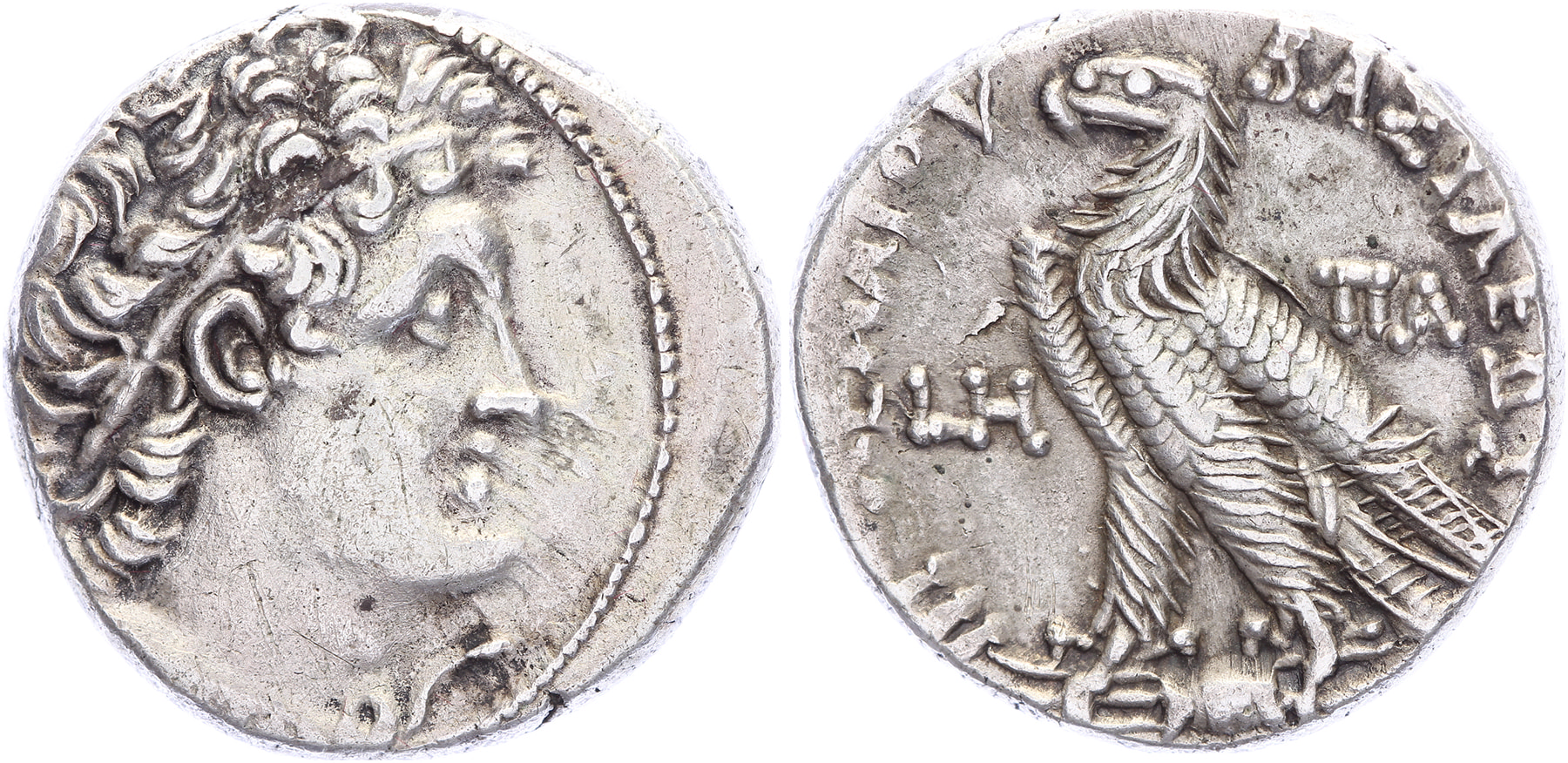 AR Tetradrachm [13,84 gm, 25,1 mm]. Alexandreia mint. Dated RY 8 (110/09 BC). Diademed bust of Ptolemy I right, wearing aegis around neck / BAΣIΛEΩΣ ΠTOΛEMAIOY, eagle with closed wings, standing left on thunderbolt; LH (date) to left, ΠΑ to right. Svoronos 1669; Olivier 5484-574; SNG Copenhagen 352. gVF.Purchased from H.D. Rauch, Auction 58, lot 124 (October 1996)