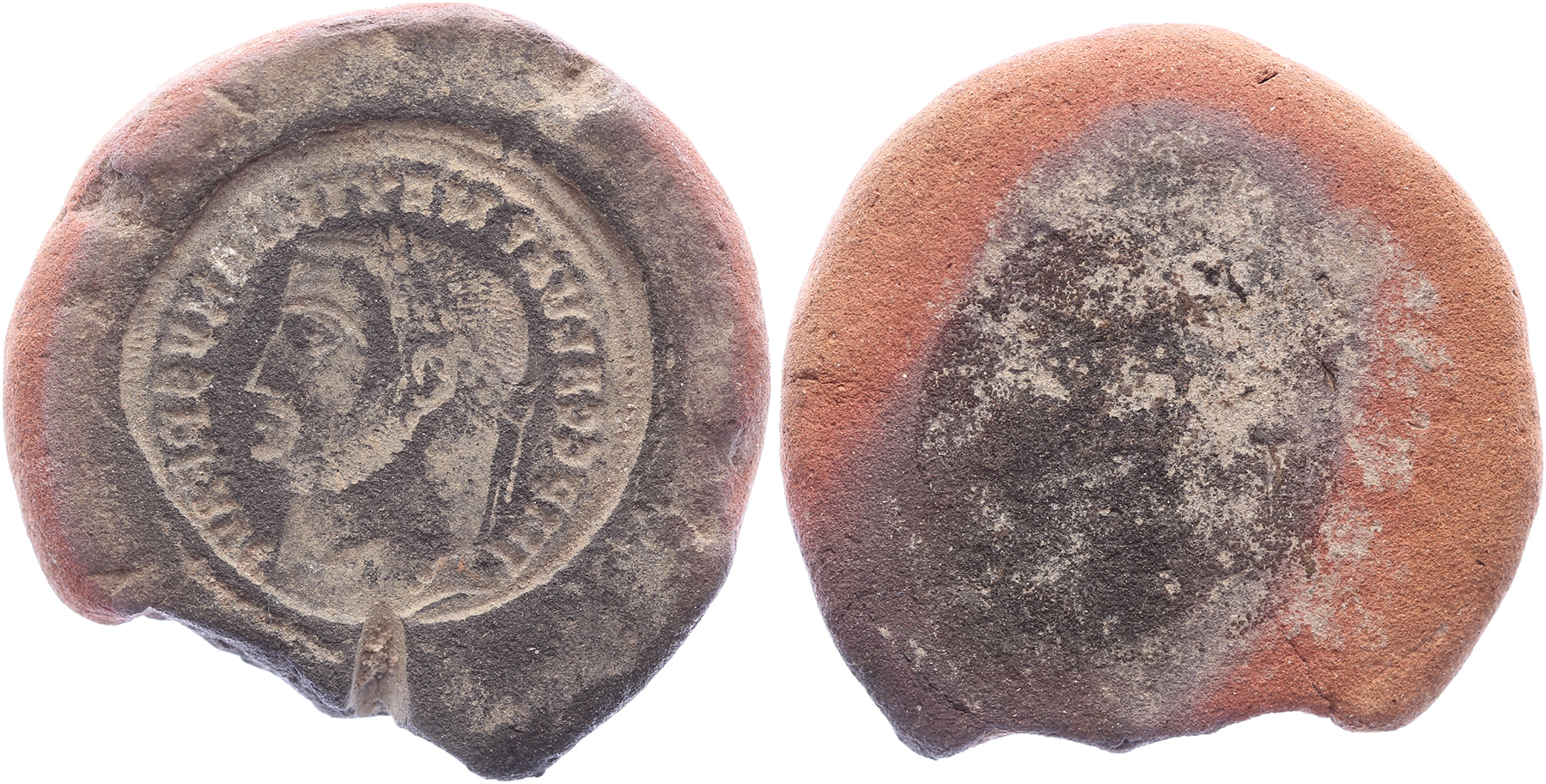 Clay forger’s mold [7,83 gm, 33 mm]. Impressed with an obverse follis of Maximinus II, from an eastern mint. IMP C GAL VAL MAXIMINVS P F AVG, laureate head right (all incuse and mirrored). Red and grey baked clay.
