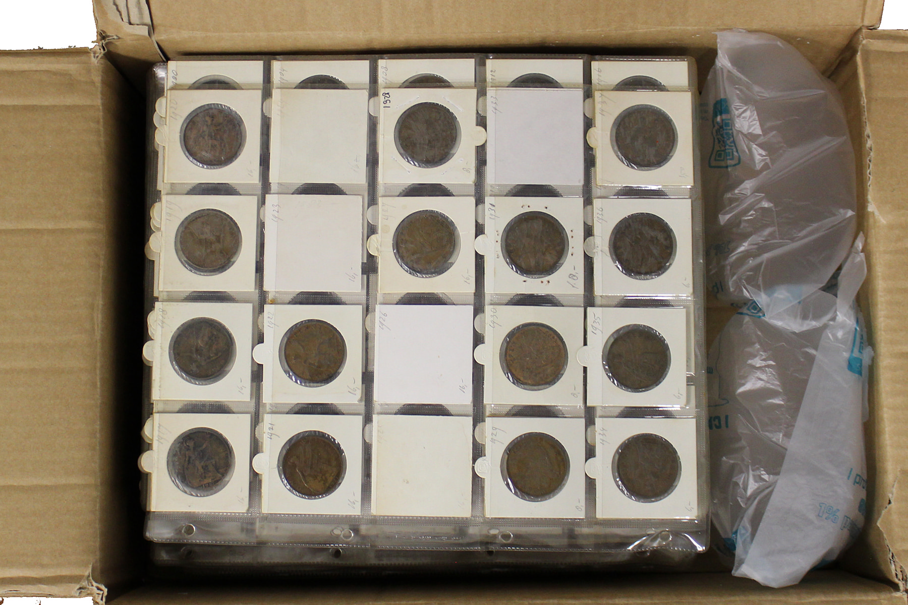 Kartonnen doos met 60 x 20-vaks bladen eenvoudige wereldmunten.