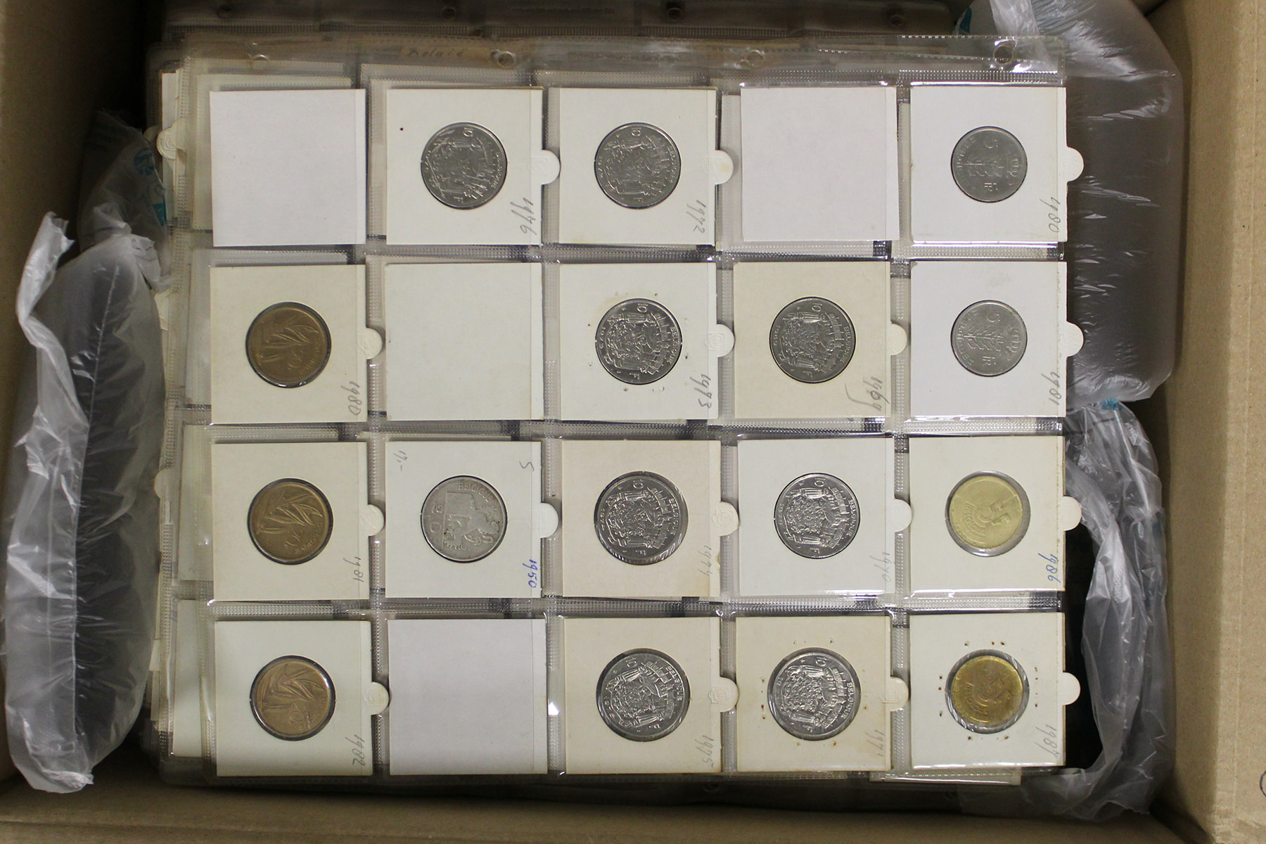 Kartonnen doos met 60 x 20-vaks bladen eenvoudige wereldmunten.