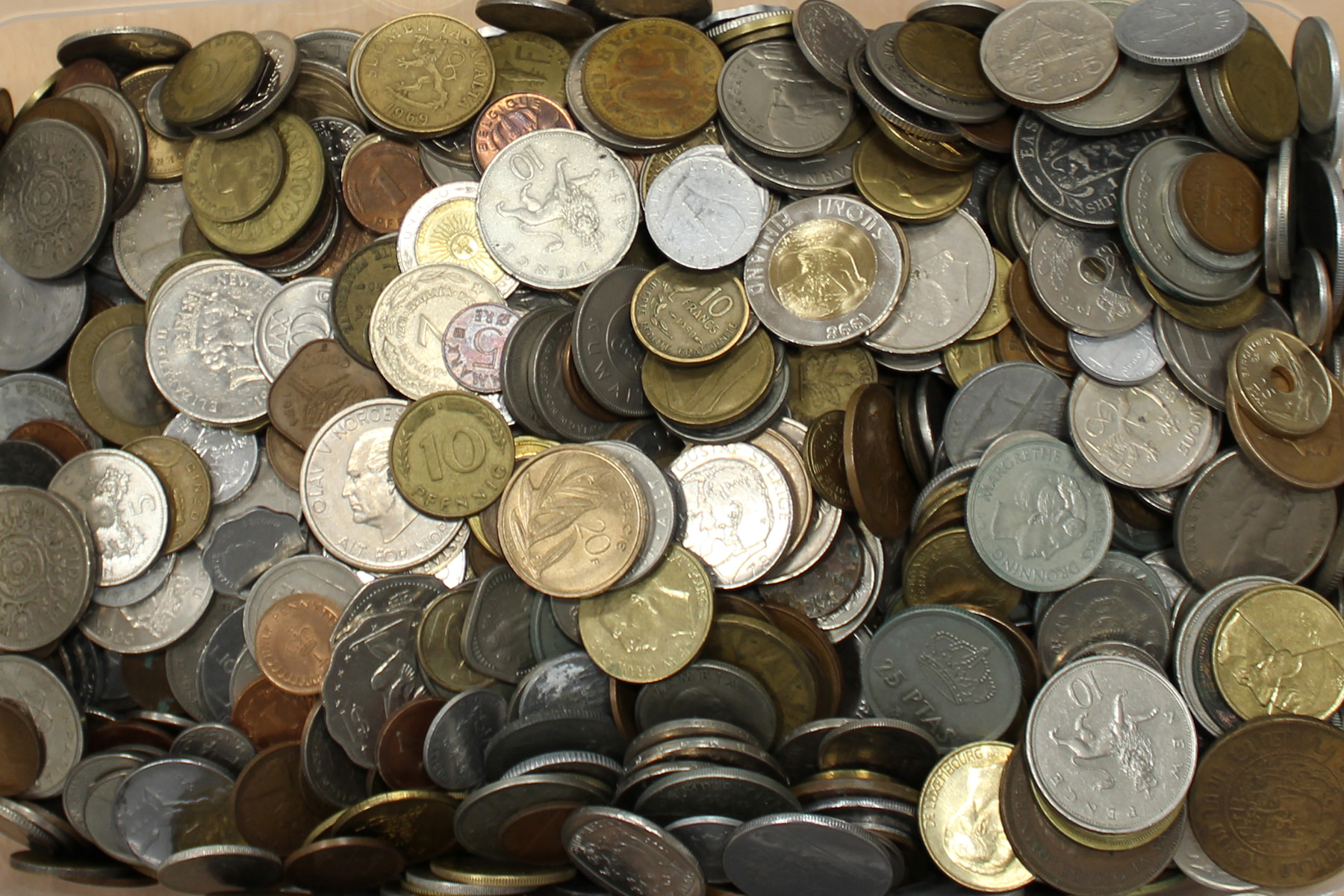 Plastic box eenvoudige wereldmunten, 10 kg., “kilowaar”.