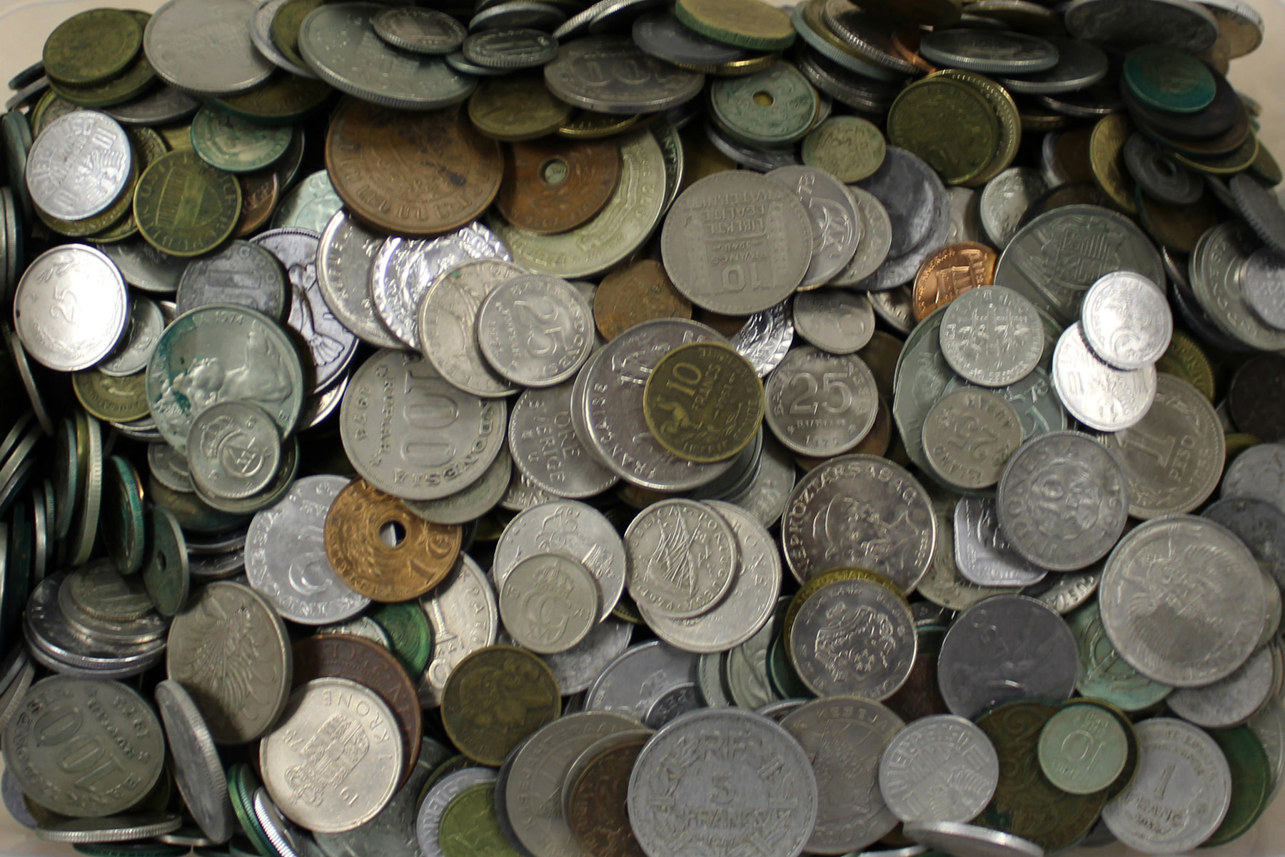 Plastic box eenvoudige wereldmunten, 10 kg., “kilowaar”.