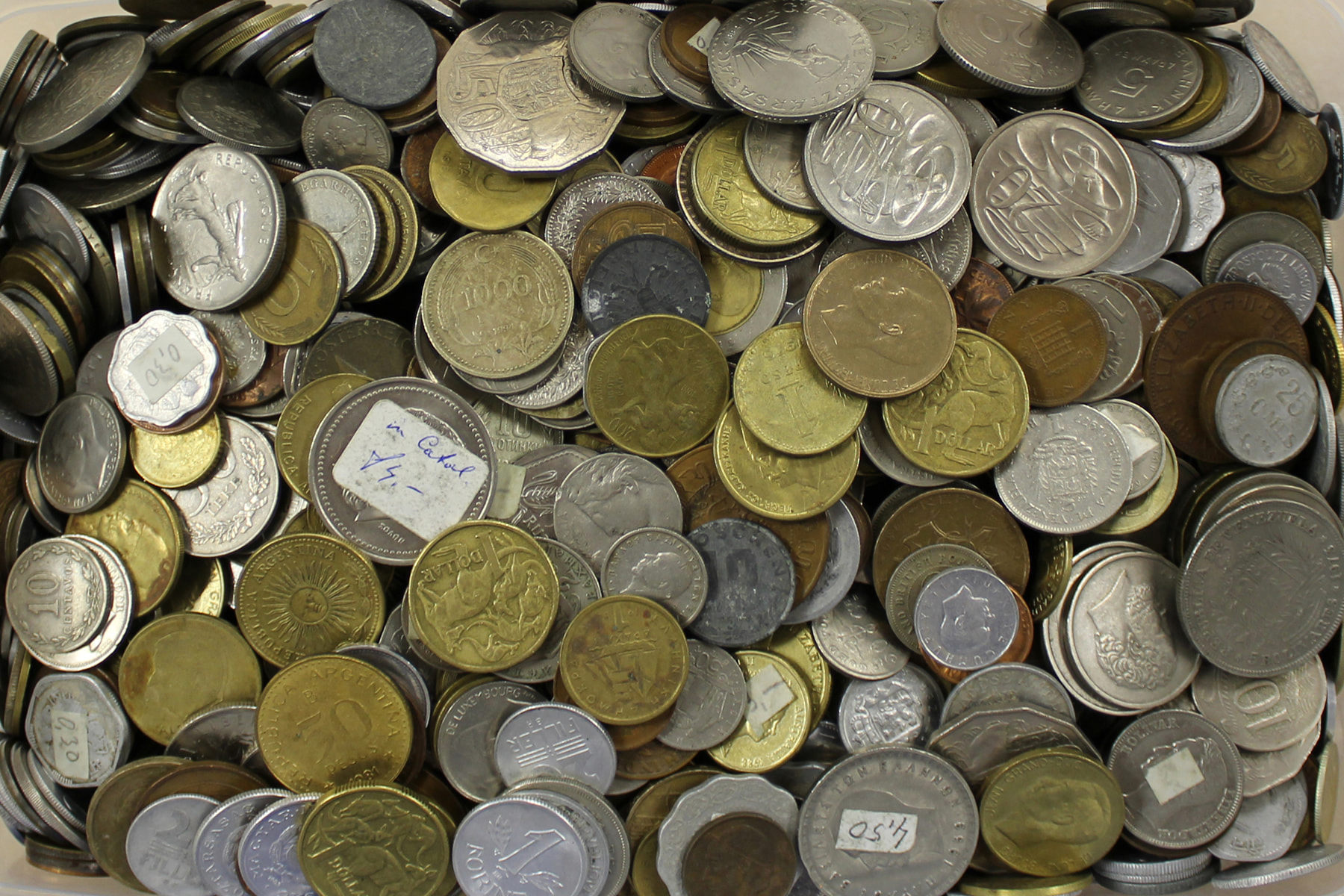 Plastic box eenvoudige wereldmunten, 10 kg., “kilowaar”.