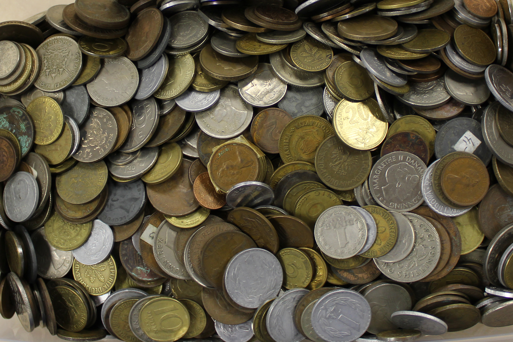 Plastic box eenvoudige wereldmunten, 10 kg., “kilowaar”.