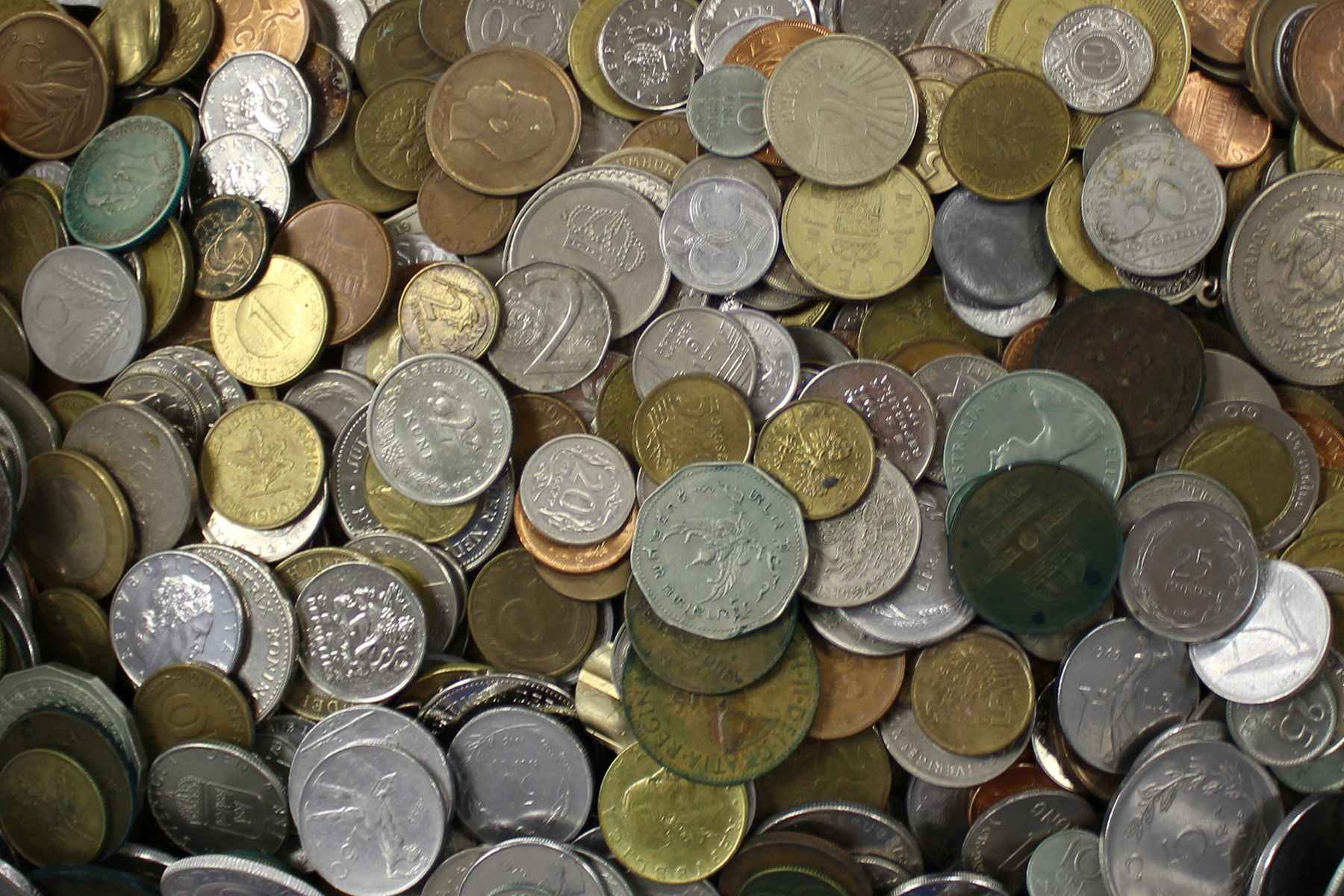 Plastic box eenvoudige wereldmunten, 10 kg., “kilowaar”.