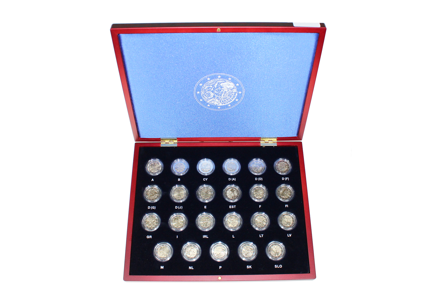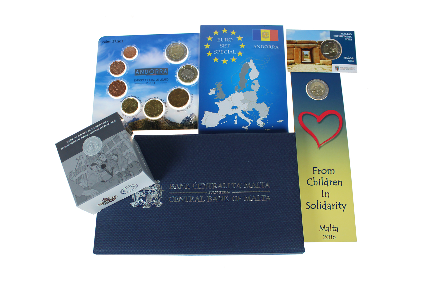 Schoenendoos met euromunten Andorra & Malta. Toegevoegd cassette ‘Erasmus programma’ 23 x 2 euro en zilveren $20 Canada.
