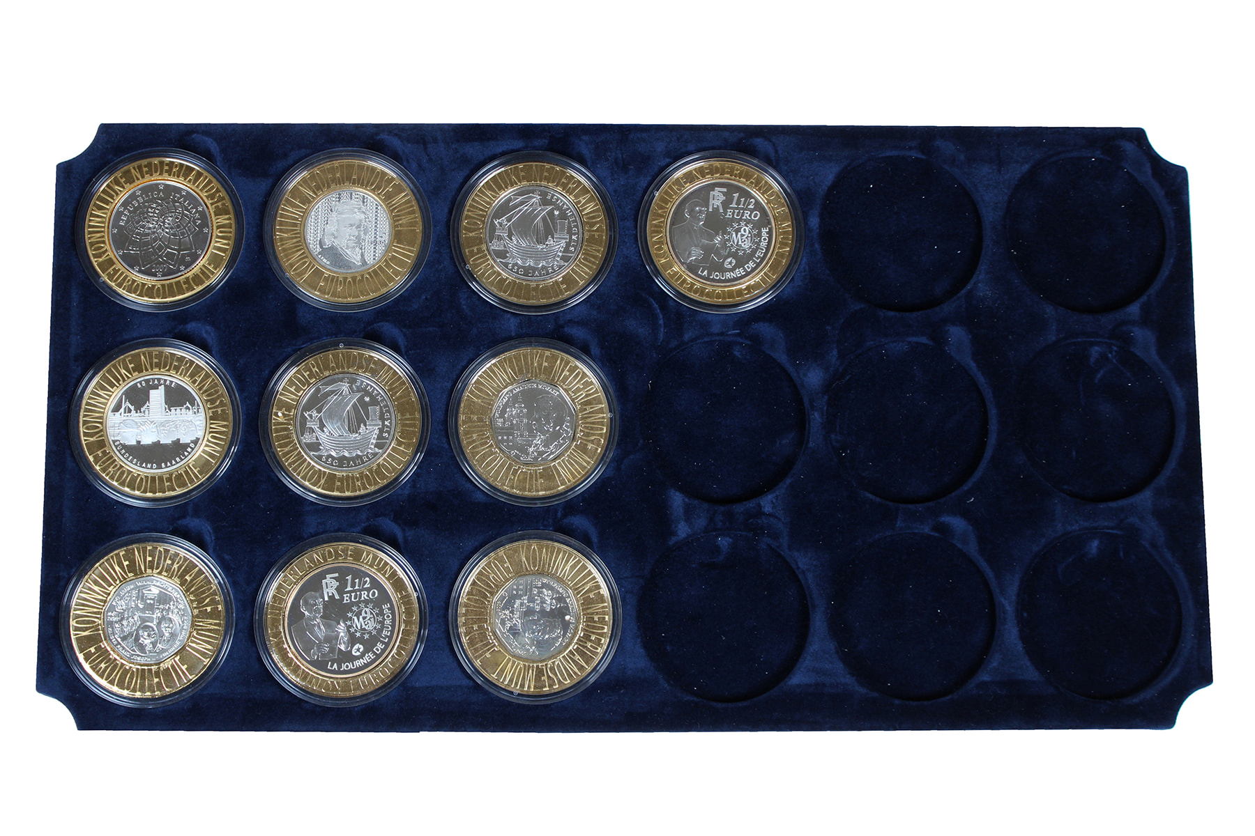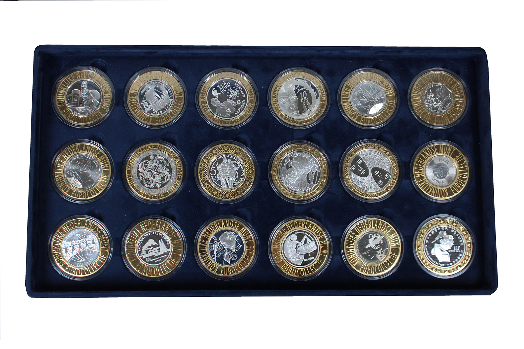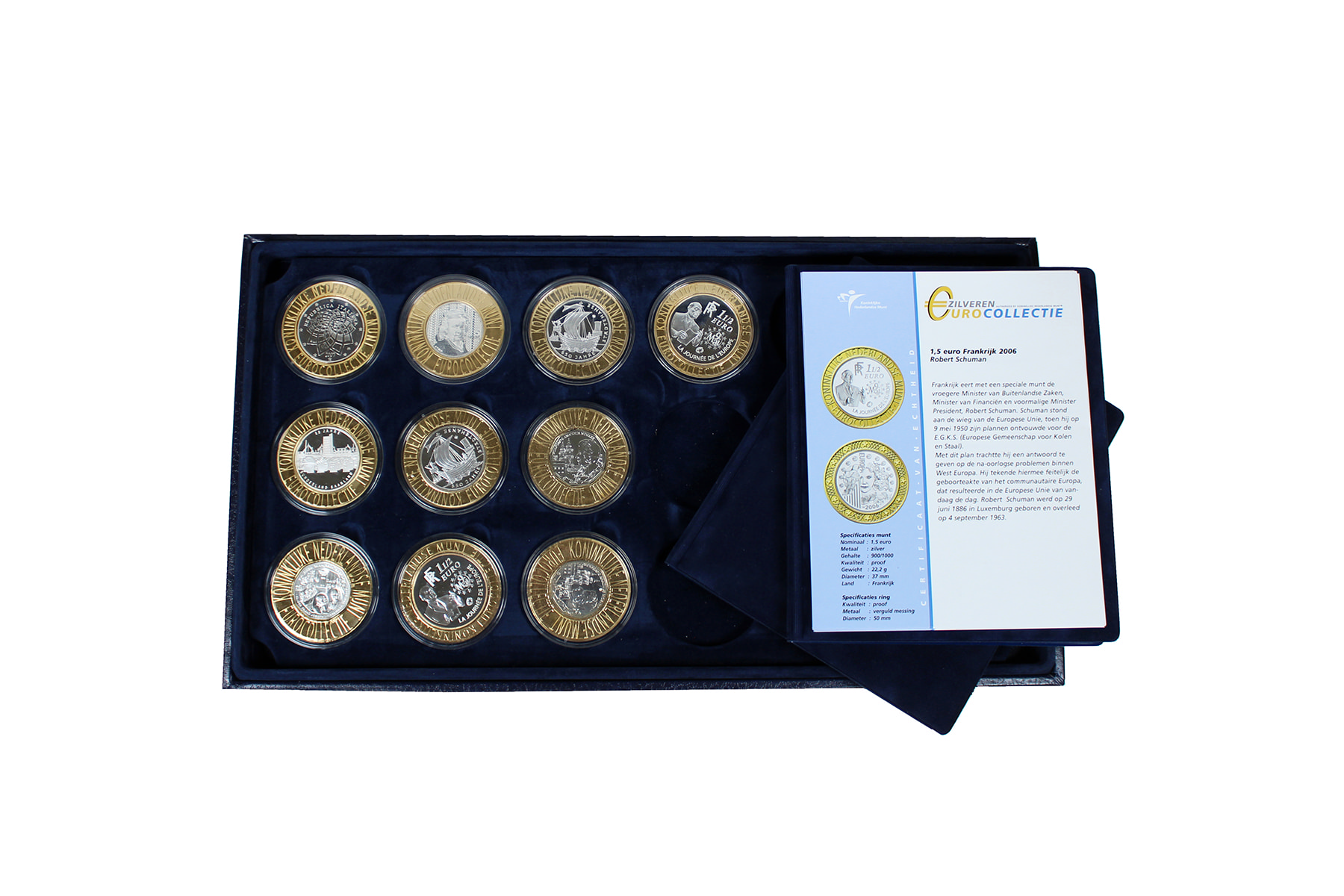 Blauwe langwerpige cassette “Zilveren Eurocollectie” met 28 zilveren euromunten gevat in een verguld messing ring. Met bijbehorende info. Uitgfite KNM. (incompleet).