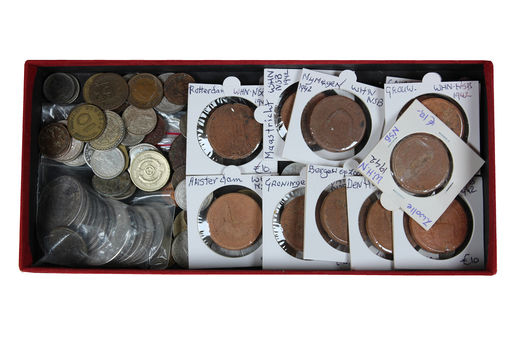 Doosje divers wereld, w.o. zilver. Tevens zakje fantasie/vals wereld. Toegevoegd: 12 x aardewerk penningen “Winter Hulp Nederland”, diverse steden.
