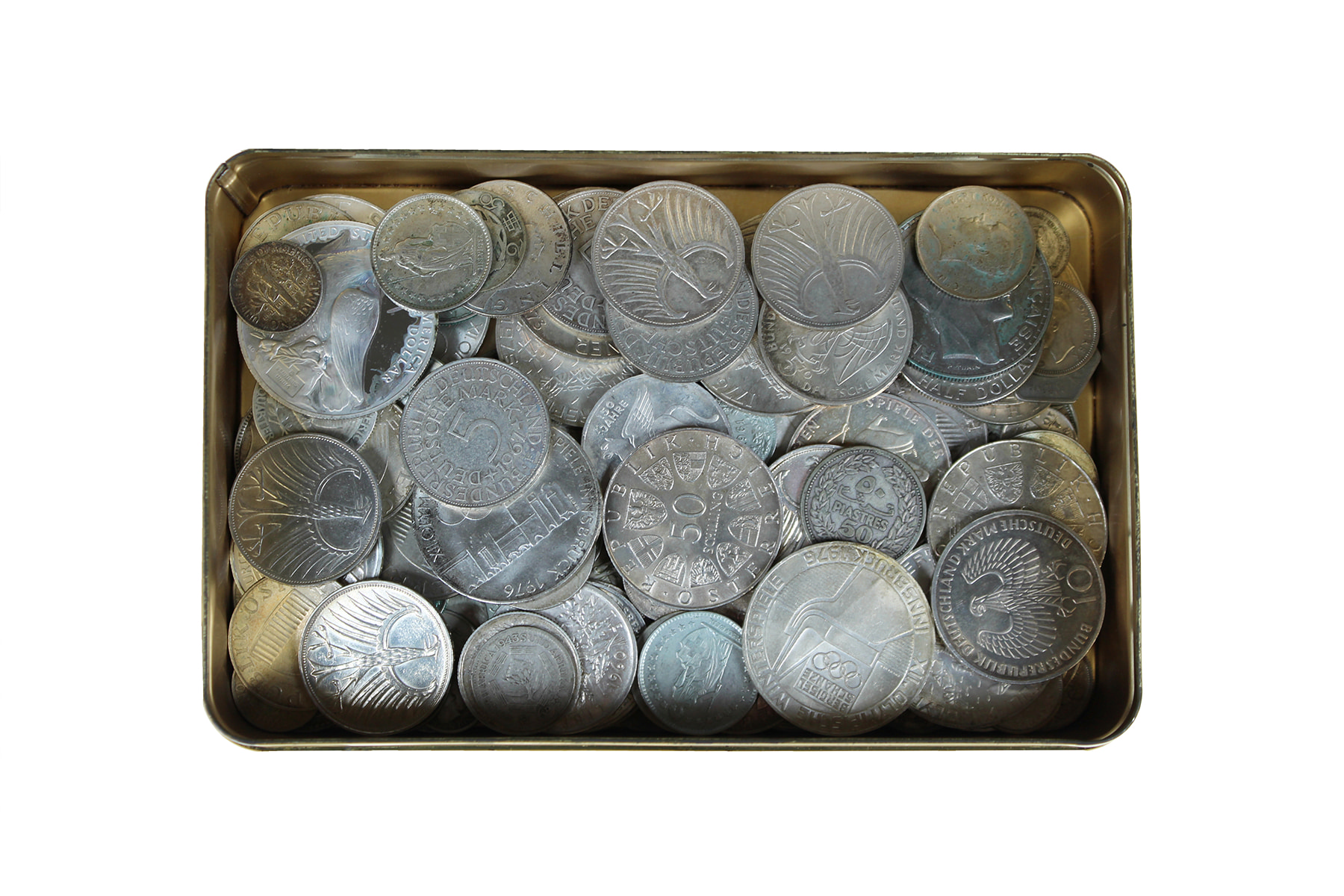 Tjoklat-blikje zilveren munten, vnl. West-Europa en 20e eeuw. Bruto: 984 gram.