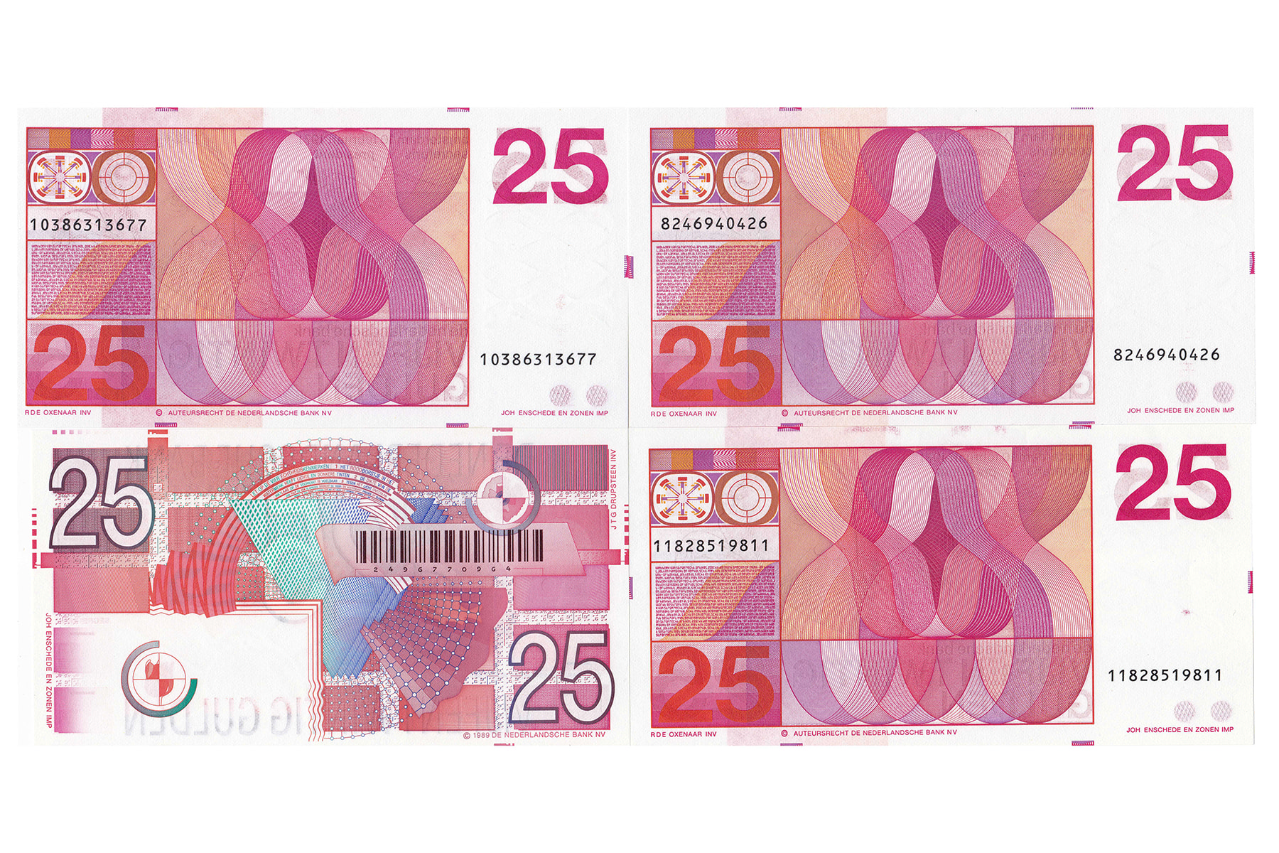 Lot (4) 25 Gulden 1971 Sweelinck (3). Mev. 84-1, 84-2; PL 70.b, 70.f [# 8246940426] [# 10386313677] [# 11828519811]; 25 Gulden 1989 Roodborstje. Mev. 85-1; PL 71.a [# 2496770964]. Vrijwel UNC.
