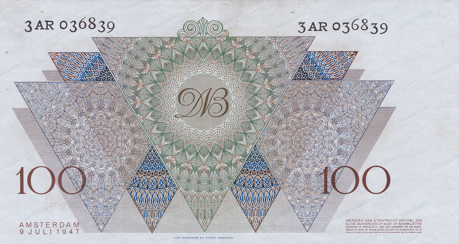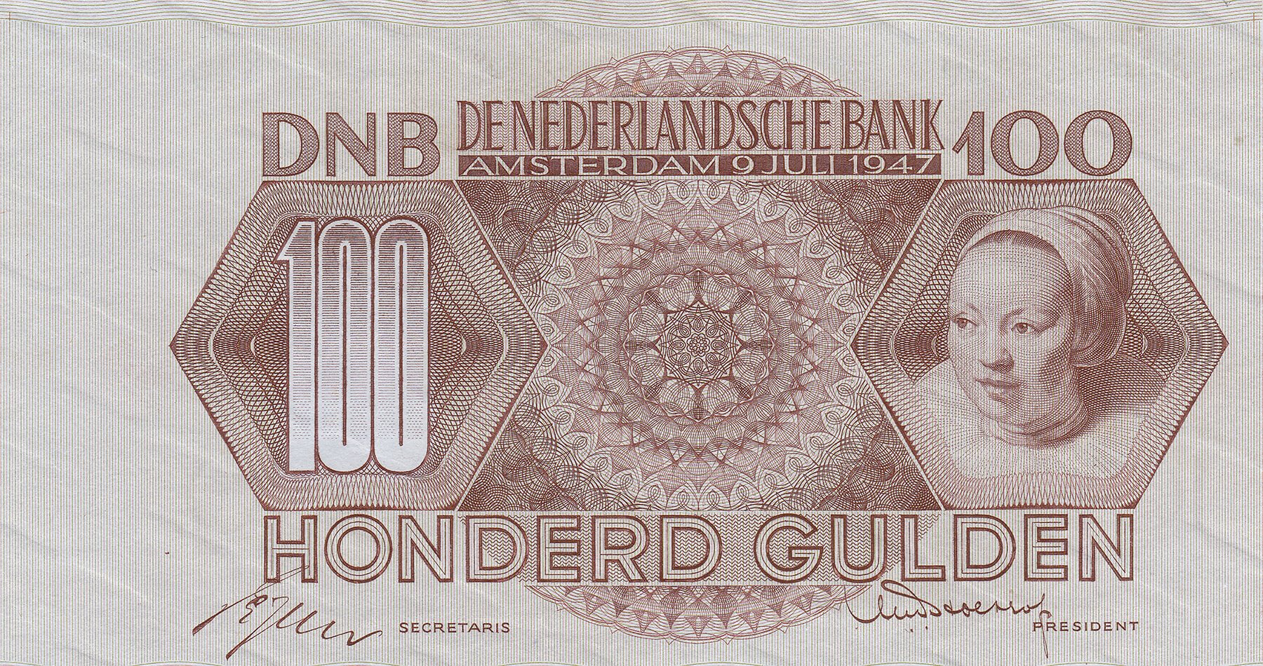 100 Gulden 1947 Adriaantje Hollaer. Mev. 120-1; PL 100.a [# 3 AR 036839]. Vrijwel UNC.