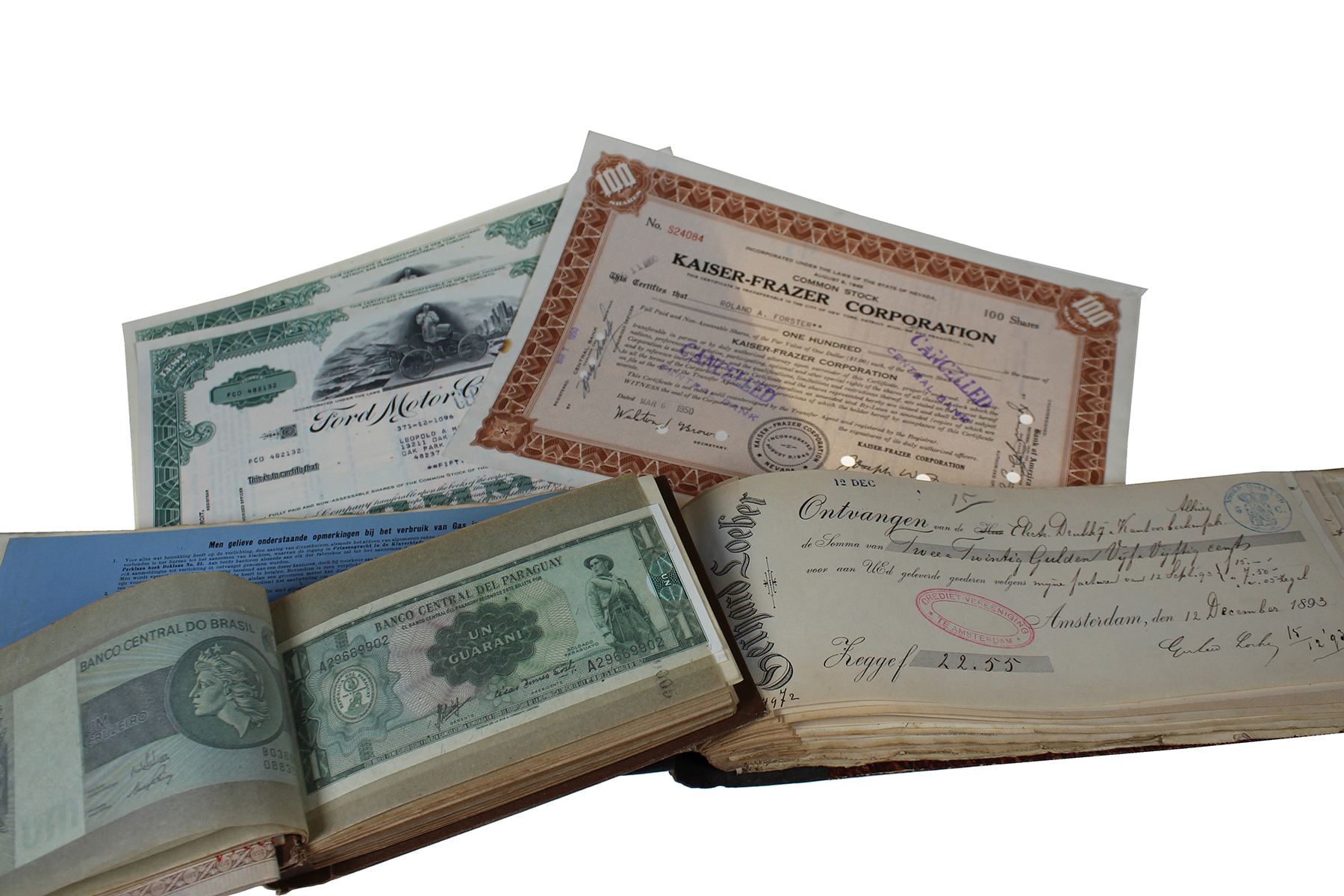 Curieus lot diverse bankbiljetten, schuldbewijzen, kwitanties en oude aandelen. Leuk!