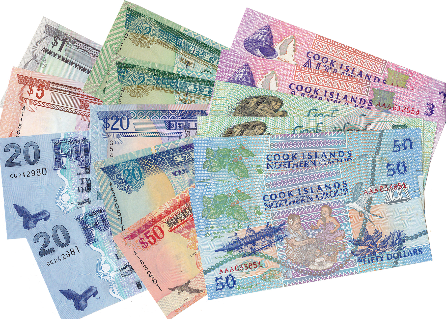 Groot lot (49) diverse landen met diverse denominaties en jaartallen. Waaronder ook enkele doubletten. Australië (Pick 22, 27, 30, 33, 37, 38, 39, 40, 42, 43, 44, 45, 51), Cook Islands (Pick 6, 7, 10), Fiji (Pick 86, 91, 95, 96, 100, 107, 112), Nieuw Zeeland (Pick 159, 163, 164, 169, 170, 172, 173, 187). Used to almost UNC.