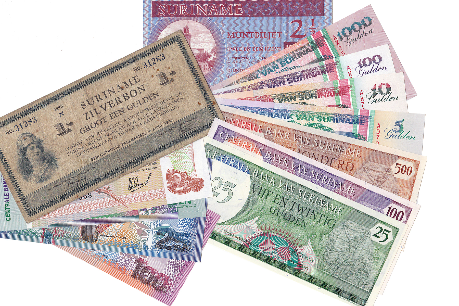 Leuke collectie biljetten van Suriname, o.a. 2 zilverbonnen. Ook betere kwaliteit. 14 stuks.