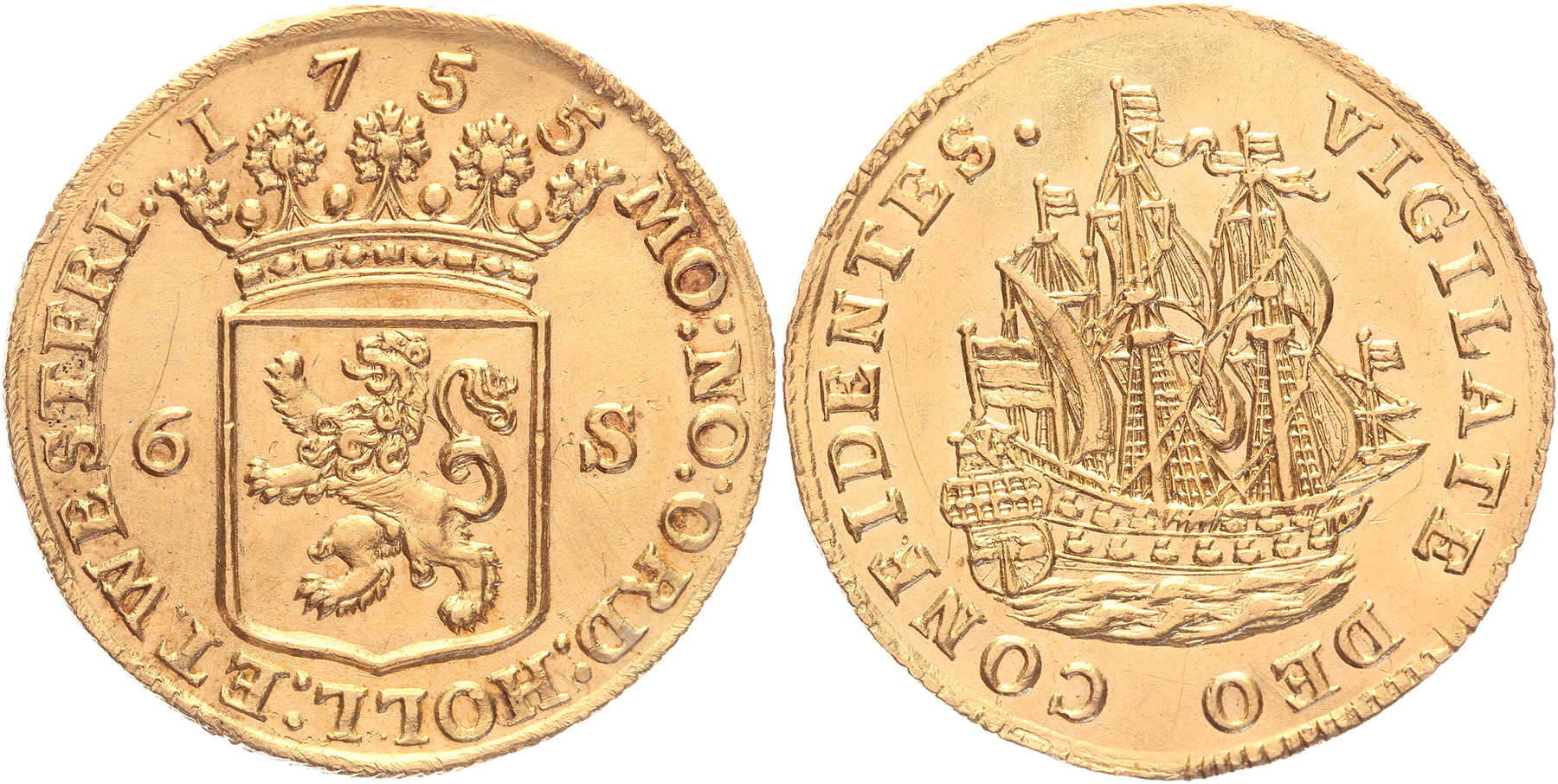 Scheepjesschelling 1775. Afslag op het gewicht van 6,92 gram. Delm. 816; CNM 2.28.116; VH&S 1265. Klemsporen. Prachtig / FDC. ⁂