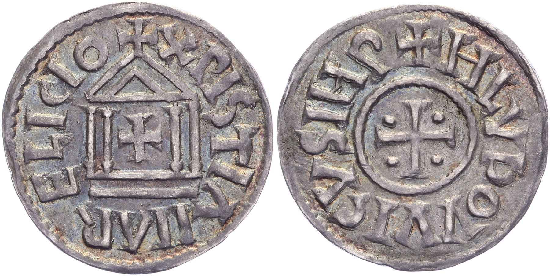 Denier z.j. (algemeen Karolingisch type Christiana Religio) met grote tempel. Kruis kz. met bolletjes.Uitzonderlijke kwaliteit! Zeer fraai.