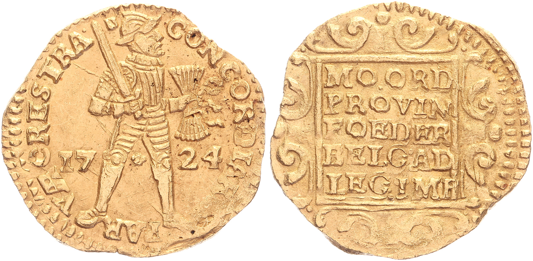 Dukaat 1724 uit VOC-schip De Akerendam. Delm. 965; CNM 2.43.45 [3,55 gram]. Zeer fraai.