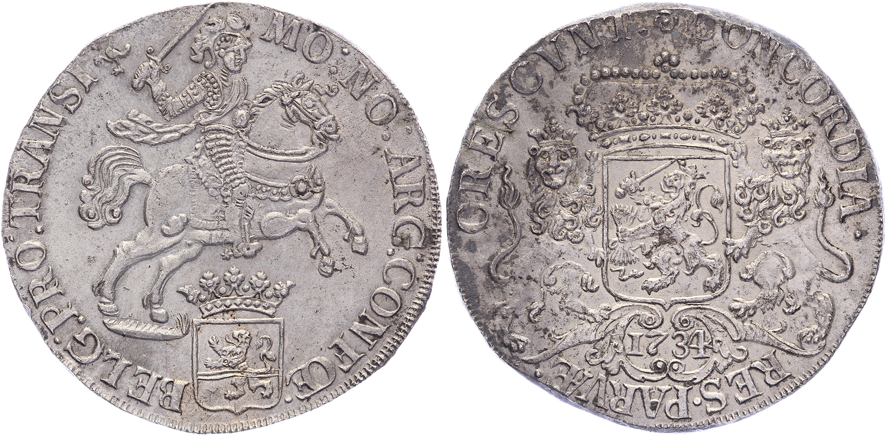 Zilveren rijder of dukaton 1734. Delm. 1036; CNM 2.38.79. Egaal grijs patina. Scherp uitgemunt. Prachtig.