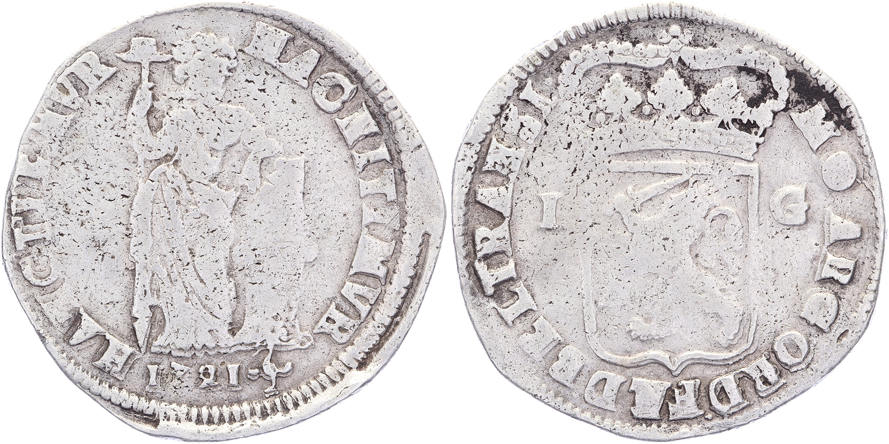 1 Gulden 1721. Delm. 1184; CNM 2.38.91; HPM 55. Jaartalwijziging en FÆD over FÆ. Fraai.