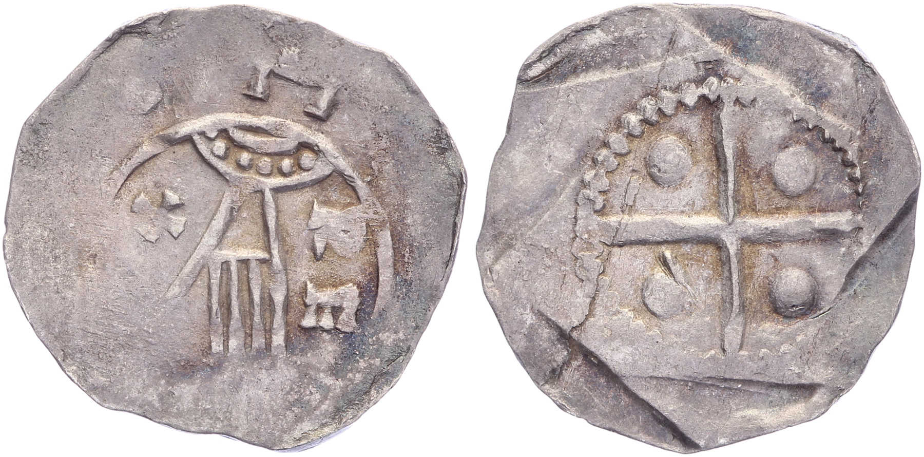 Denier z.j. Omschriften niet leesbaar. Keerzijde groot gevoet kruis met 4 bollen. Mogelijk een imitatie?Vgl. FD 9. Zeer fraai.