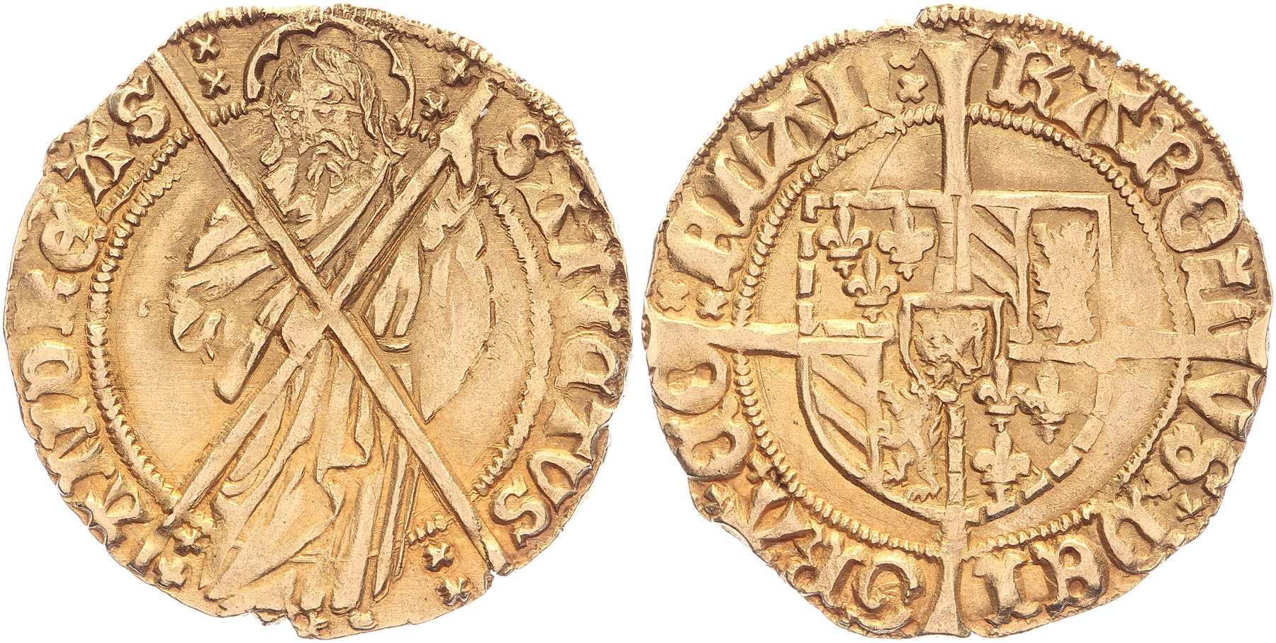 Bourgondische- of St. Andreasgulden z.j. (1474-77). GH 32-3 var.; De Mey 407 [3,43 gram]. Schaars. Ruim zeer fraai.