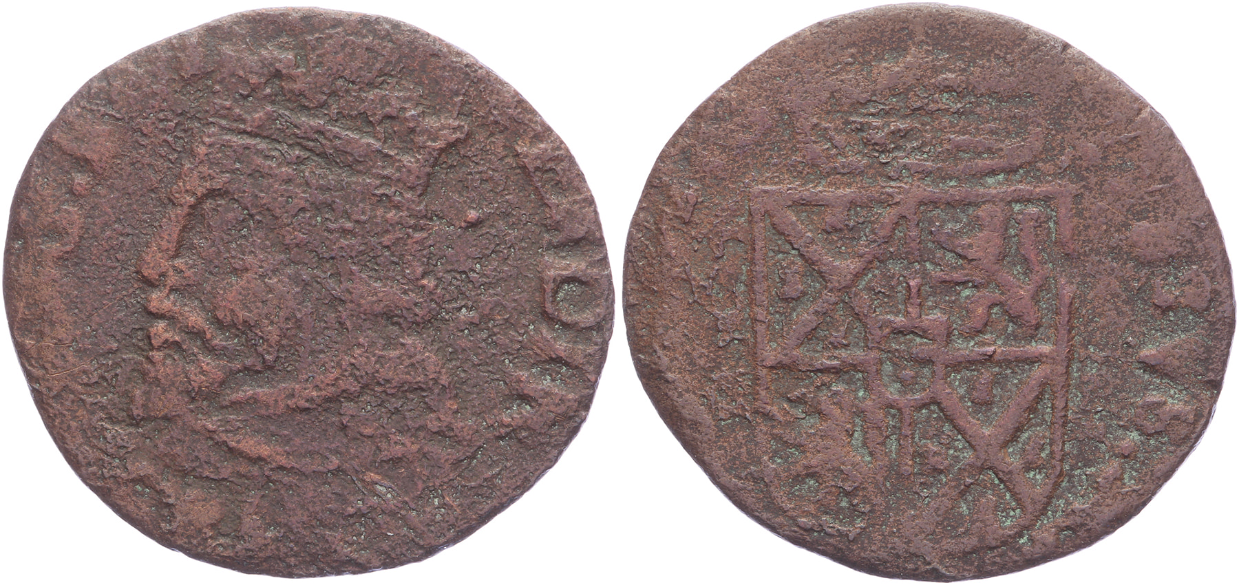 Oord z.j. voorzijde: gekroond portret naar links, keerzijde: gekroond wapen, linksboven en rechtsonder leeuwen naar rechts, rechtsboven en linksonder Batenburg. Lucas 84 of 86; PW -; CNM 2.22.60. Fraai. ⁂
