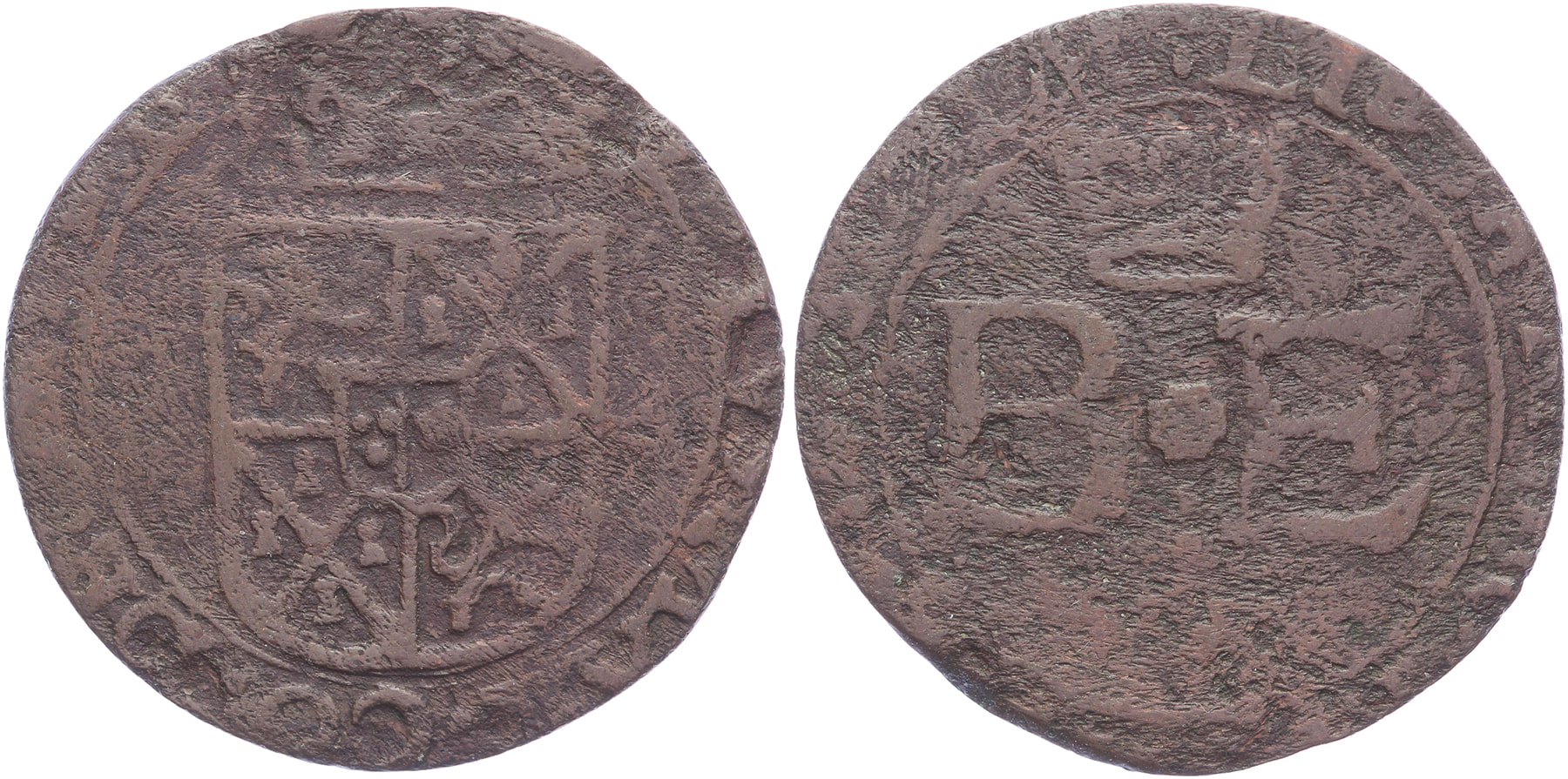 Oord z.j. voorzijde: wapenschild in vieren met in 1 en 4 Batenburg (leeuwen naar rechts). 2 en 3 Bronkhorst gedekt, met Gronsveld-Eberstein. Lucas 99-var (afwijkend qua omschrift en interpuncties); Vgl. Van Daalen 54; PW 9119.2-var (binnencirkels); CNM 2.22.74-var. Ruim fraai. ⁂