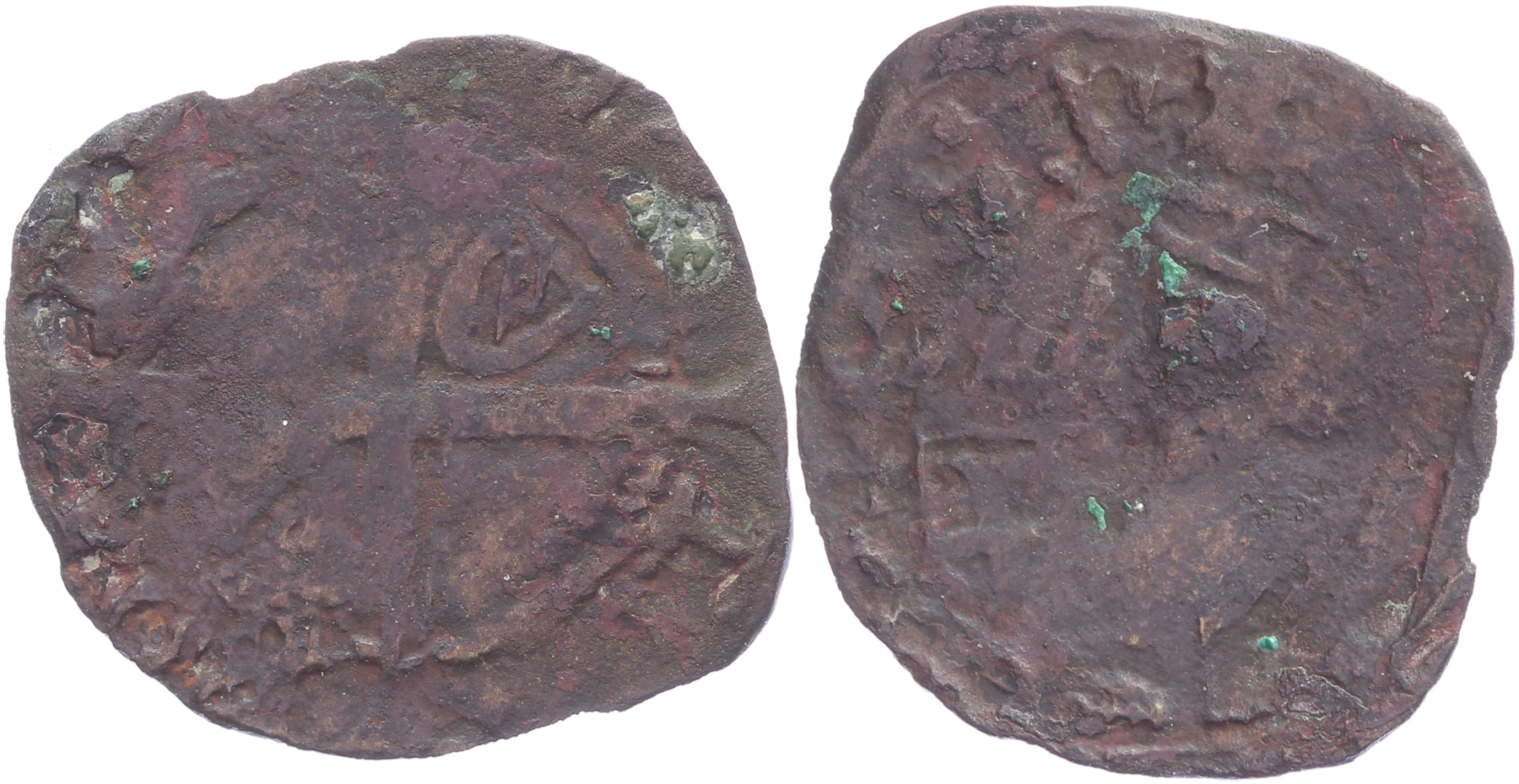 Mijt z.j. Voorzijde als ‘Lucas 8’; keerzijde lang gevoet kruis, 2 wapentjes tussen de benen van het kruis.Lucas -. Uiterst zeldzaam (RRR). Zeer goed / Fraai. ⁂