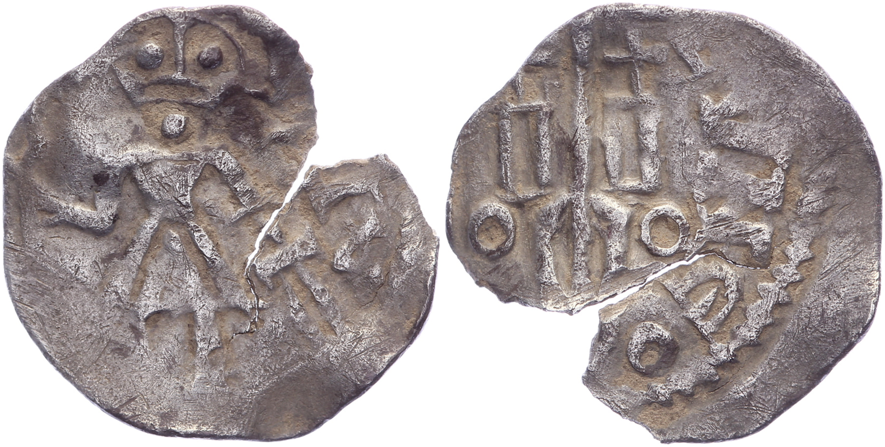 Denier z.j. Maastricht? (± 1070-1090, Théoduin). Voorzijde: staande man met lans en zwaard, keerzijde: twee rechthoeken met een kruis, daartussen een lans. Ilish 35.19; Dannenberg 292; Dengis 158. Zeer zeldzaam (RR). Niet rond, slagbarst. Zeer fraai. ⁂Ex Veiling Elsen, veiling 162, kavel 1487