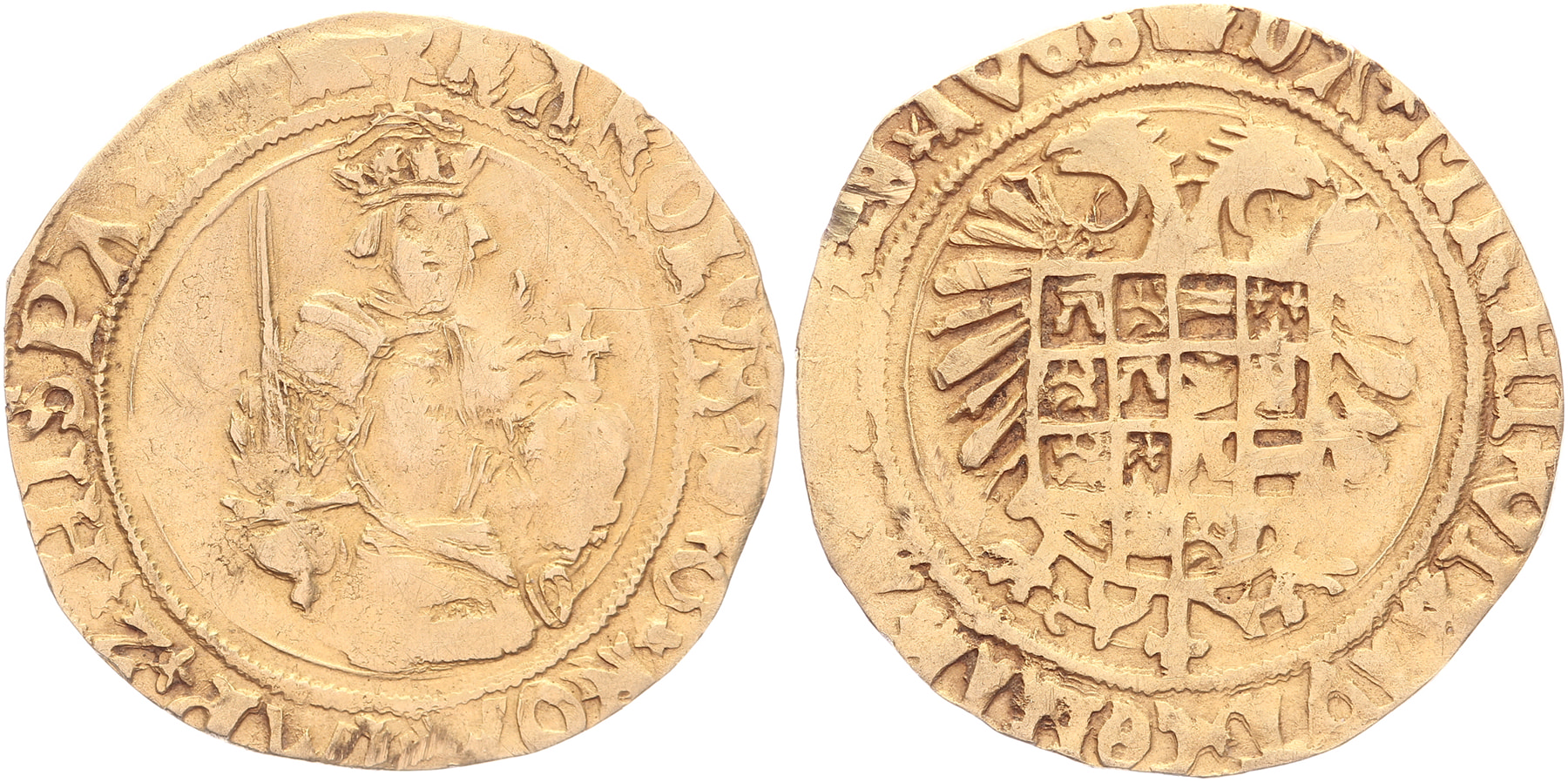 Gouden Karolusgulden z.j., tweede emissie [2,74 gram]. Voorzijde: ster; Keerzijde: kroontje aan begin van omschrift; Interpunctie: sterren. GH 185-2a; Vanhoudt 222; Delm. 107, Saunders/Vanhoudt 165. Zeer zeldzaam (RR). Zeer fraai. ⁂