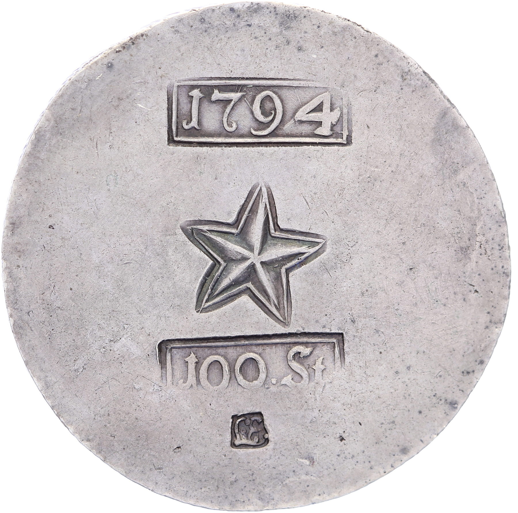 100 Stuiver 1794, eenzijdig geslagen. Delm. 756; Vanhoudt 895; CNM 2.33.10. Zeldzaam (R). Zeer fraai. ⁂