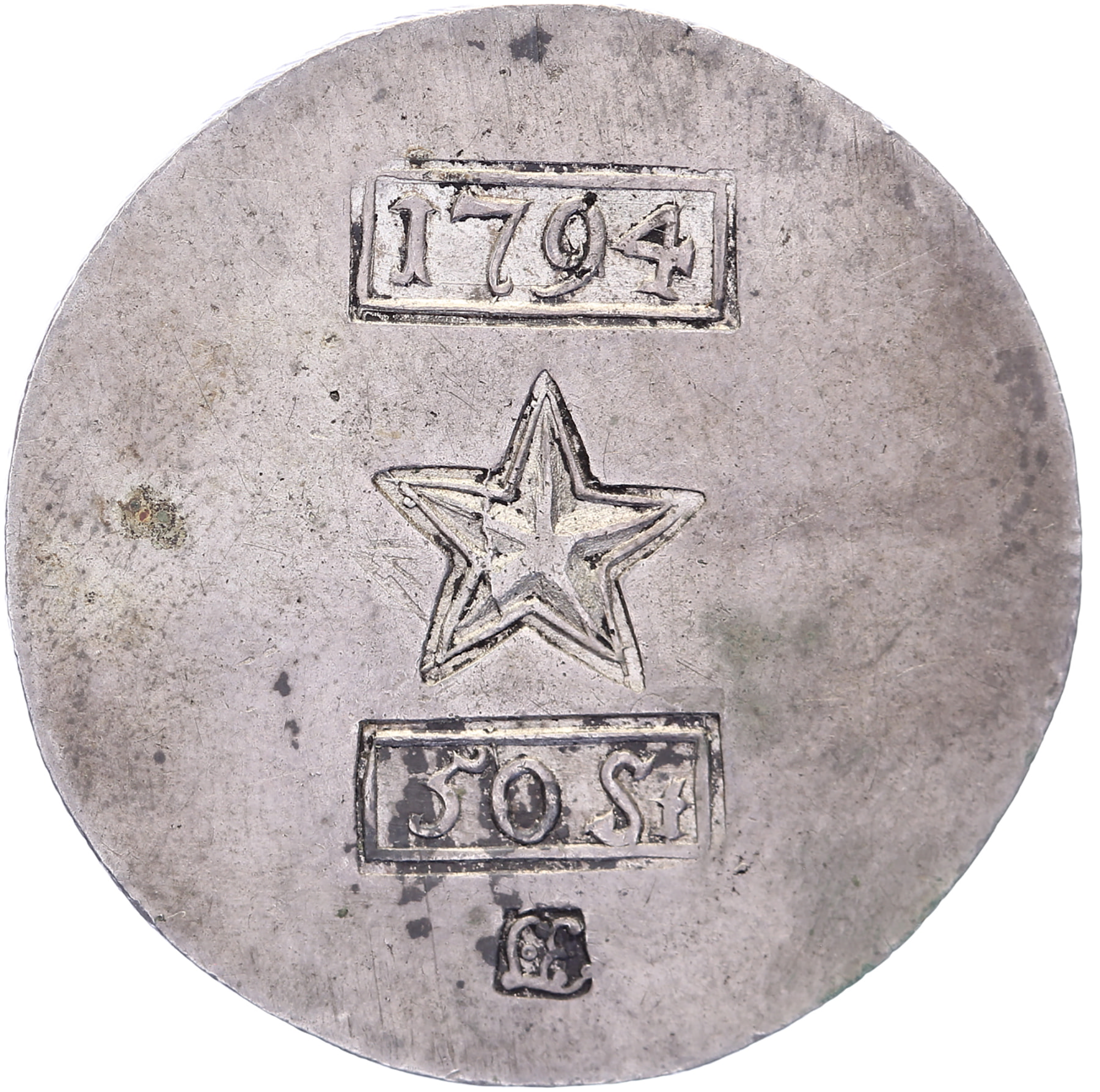 50 Stuiver 1794, eenzijdig geslagen. Delm. 757 (R2); Vanhoudt 896 (R3); CNM 2.33.11. Ruim zeer fraai. ⁂Ex Veiling Schulman, veiling 353, kavel 371