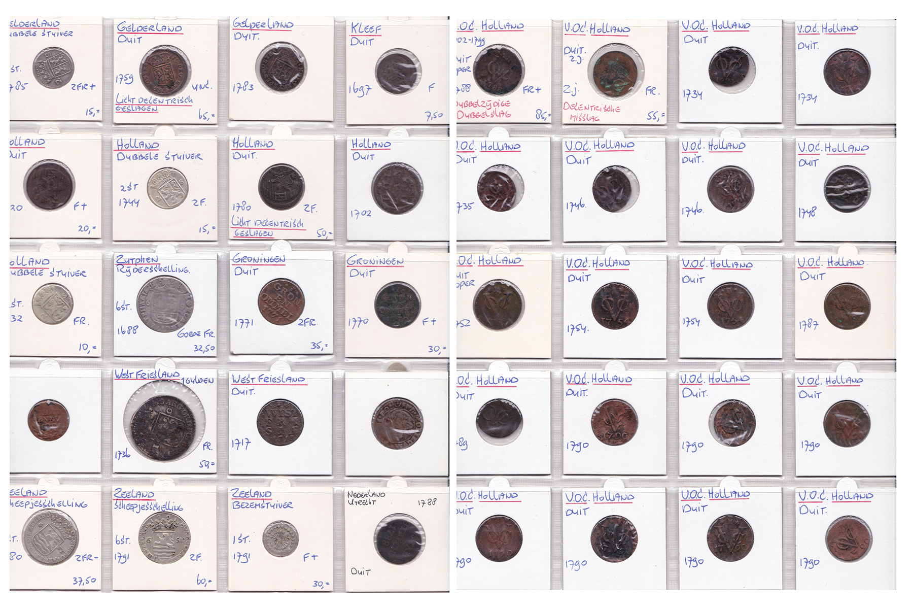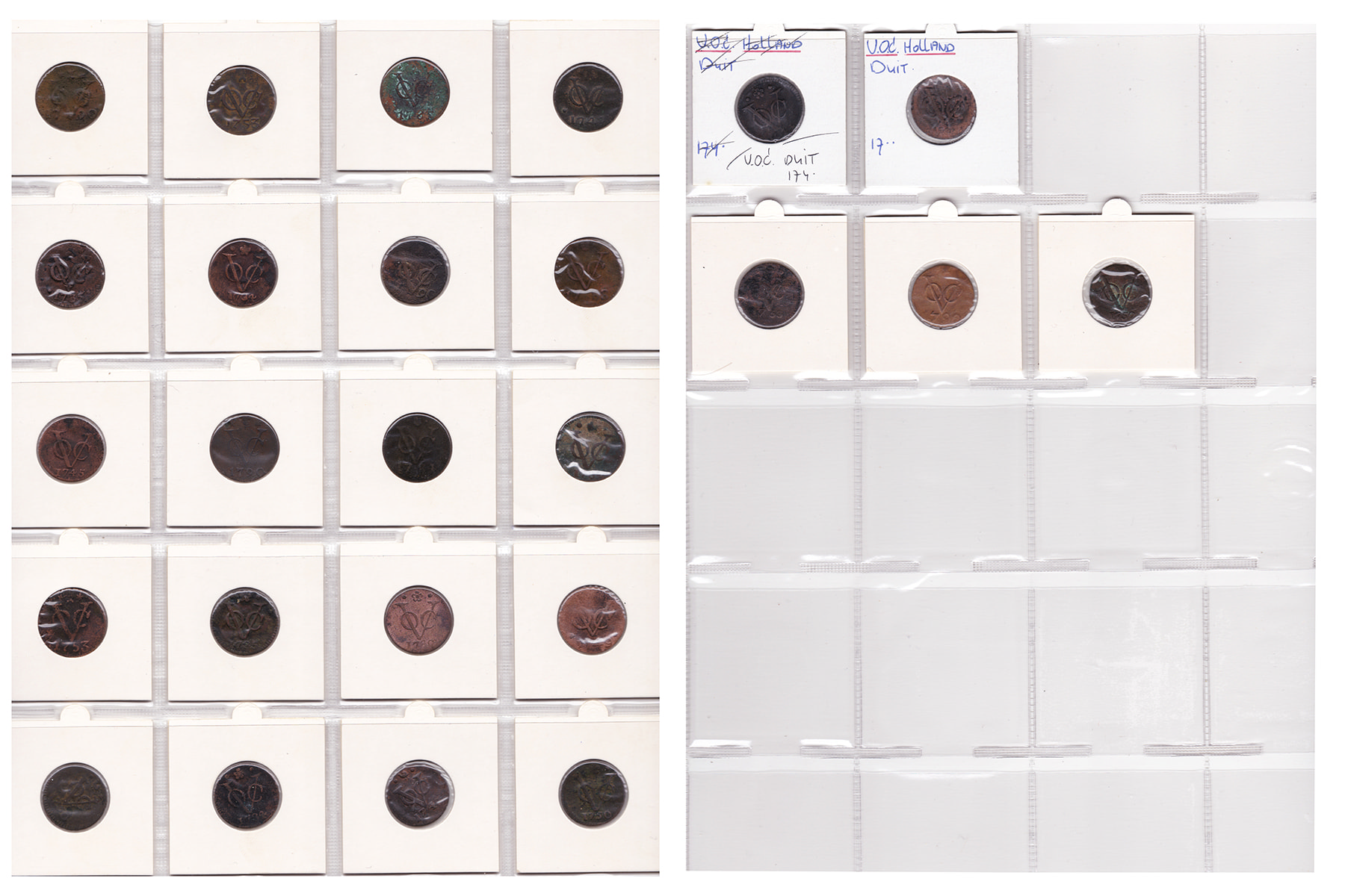 Groen album (65) met 20 provinciale munten van duit t/m gulden en 45 VOC duiten. Verschillende kwaliteiten.