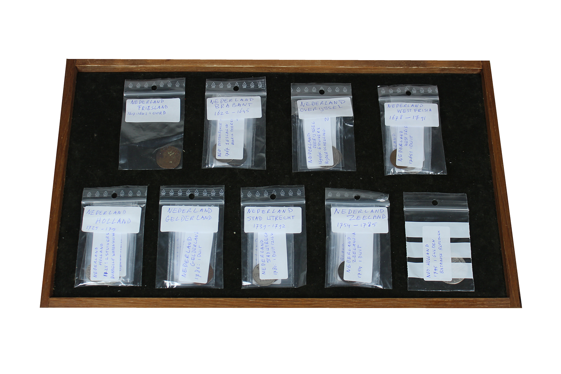 Doosje met 34 munten van diverse provincies alsook Zuidelijke Nederlanden. Van duit t/m gulden en van liard t/m ¼ patagon. Voornamelijk mindere kwaliteiten.