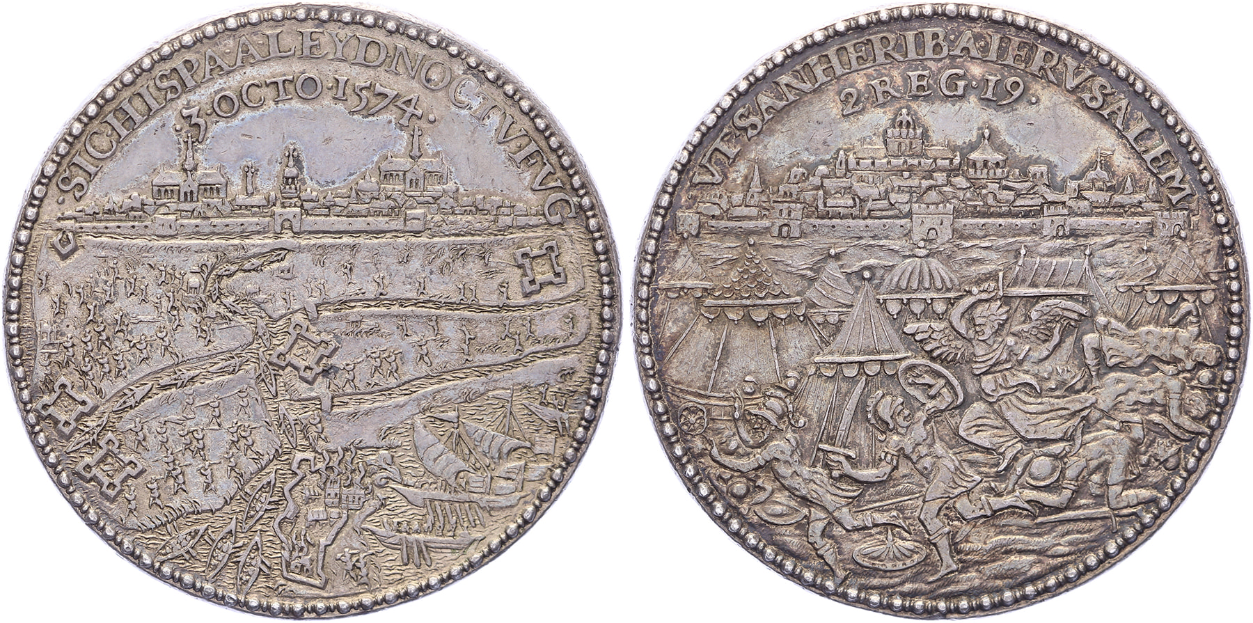 1574 Leiden ontzet. Gezicht op Jerusalem, op de voorgrond vlucht van Sanherib. / Gezicht op Leiden en de vlucht van de Spanjaarden met op de voorgrond de brandende schans van Zoeterwoude. AR 47,8 [34,60 gram]. cf vL I-195. (G. van Bylaer). Ruim zeer fraai.