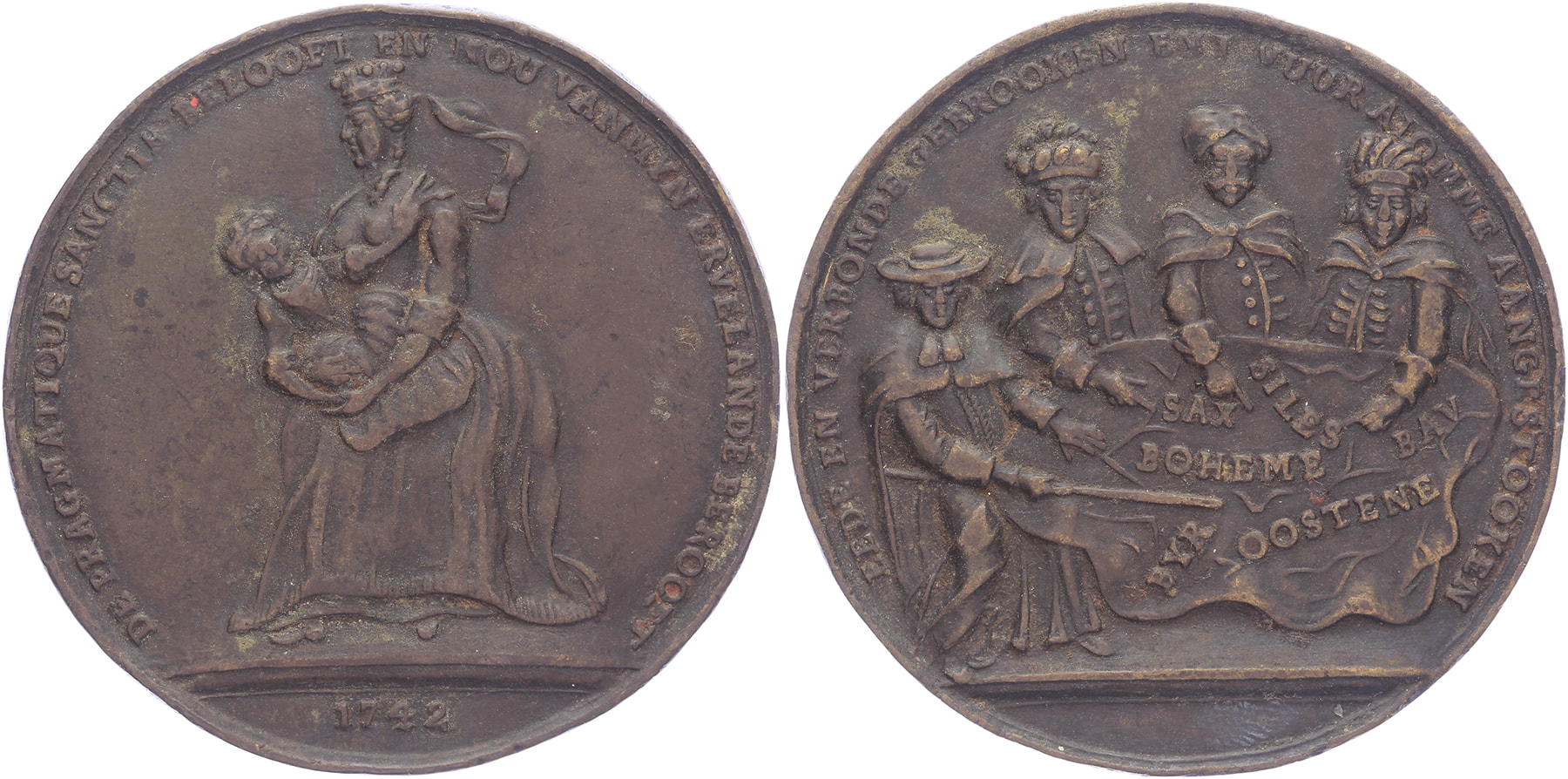 1742 Spotpenning op het doorbreken van de Pragmatieke Sanctie. Kardinaal De Fleury, de keurvorsten van Saksen en Beieren en de koning van Polen aan tafel met landkaart. / Keizerin Maria Theresia met Joseph II op schoot. Messing 42,8. DPR III-750. Zeer fraai.