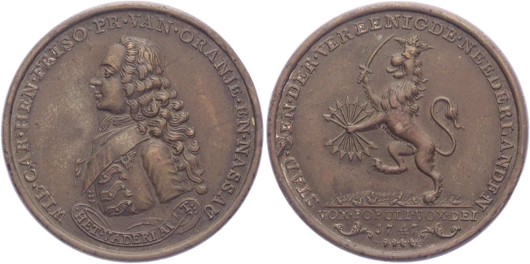 1747 Verheffing Willem Karel Hendrik Friso tot stadhouder Willem IV. Buste van Willem IV naar links gewend. / Springende leeuw met in de rechterpoot een sabel en in de linker een pijlenbundel. Æ 40. VvL 239. Zeer fraai.