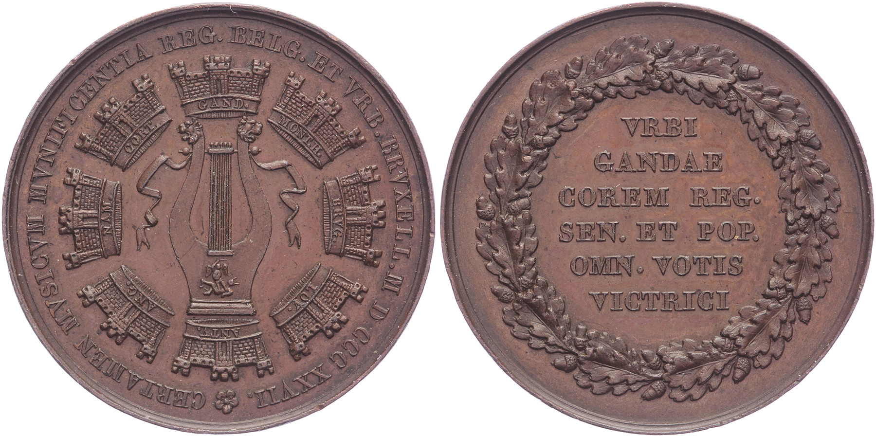 1827 Brussel, muzikale wedstrijd. Lier omgeven door 7 muurkronen. / Zesregelig opschrift binnen eikenkrans. Æ 27. Dirks 289. (J.P. Braemt). Prachtig.