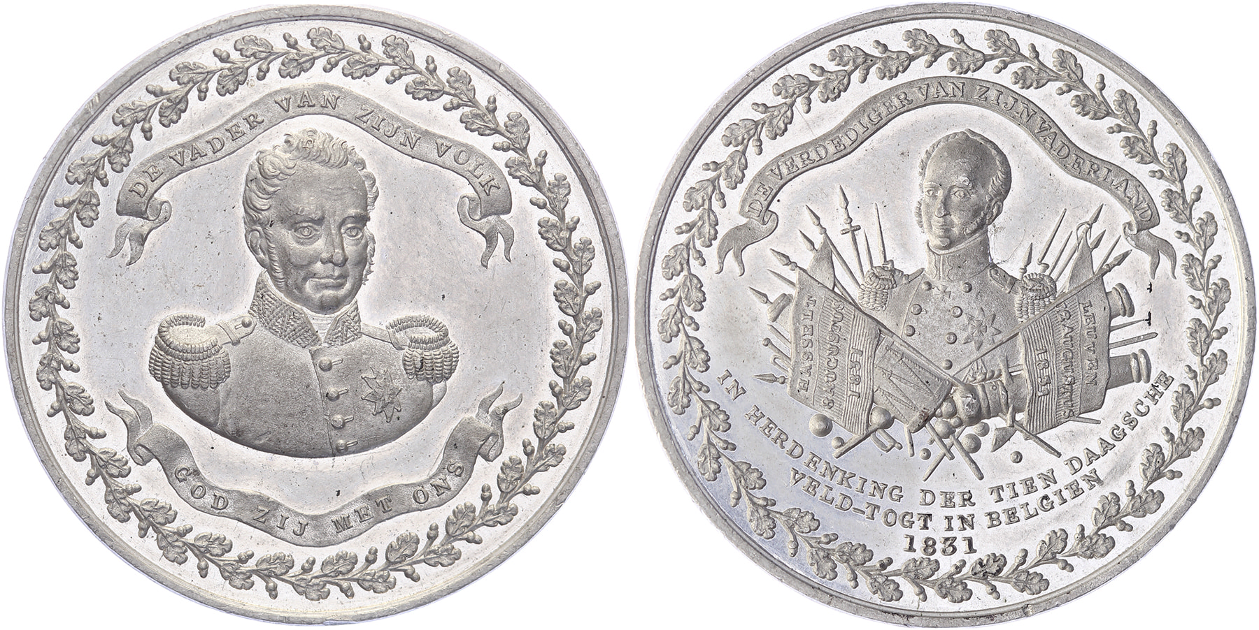 1831 Tiendaagse veldtocht in België. Borstbeeld koning Willem I tussen erelinten. / Borstbeeld koning Willem II omgeven door wapentuig, links en rechts vaandels met daarop teksten. Tin 41,4 [25,4 gram]. Dirks 442; Bax B10.3.3. J.P. Schouberg. Vrijwel FDC.