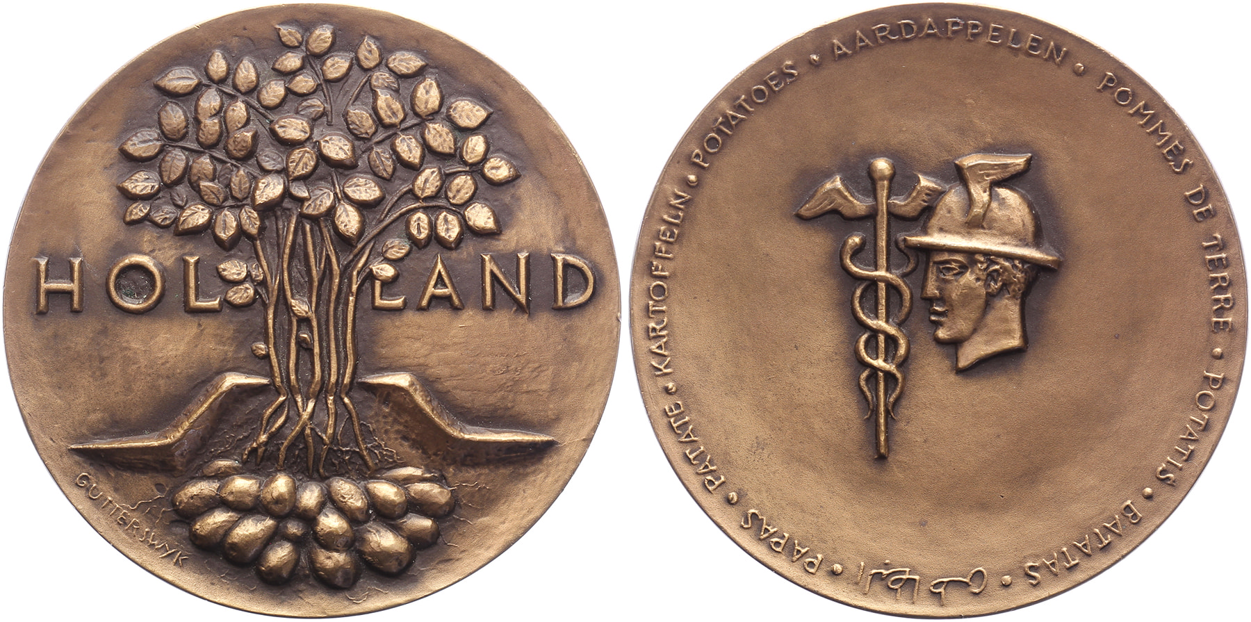 (1963) Agrarische propaganda. Aardappelplant boven én onder de aarde. / Mercuriushoofd.Æ gegoten 80. KB VI-2795. J.B. Gutterswijk. Prachtig.