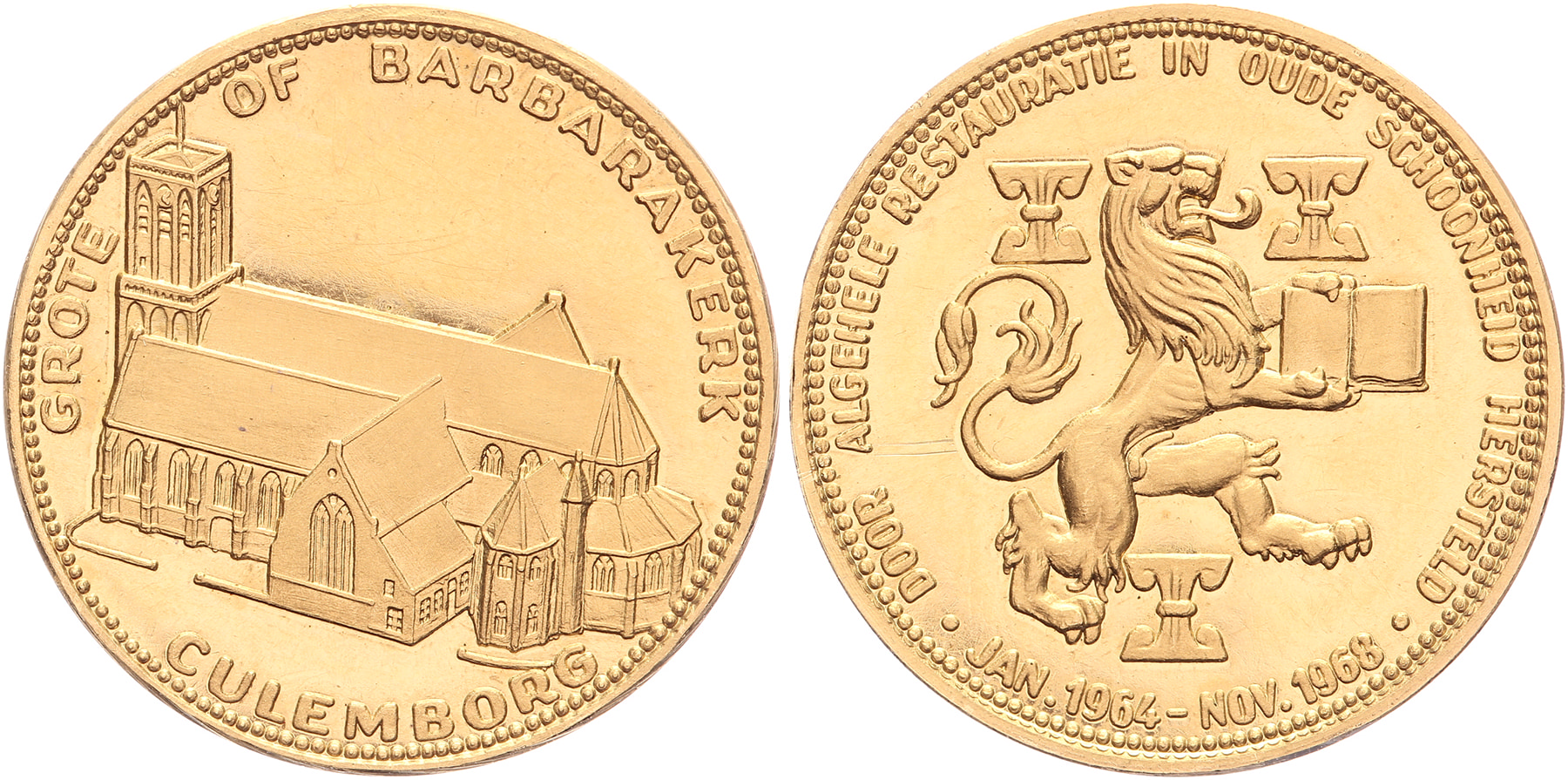 1968. Culemborg. Voltooiing restauratie Grote- of Barbara Kerk. Gezicht op de kerk in vogelvlucht. / Naar rechts gaande leeuw met boek in de voorpoten. AU 22,3 [7,14 gram, 900/1000]. FDC.