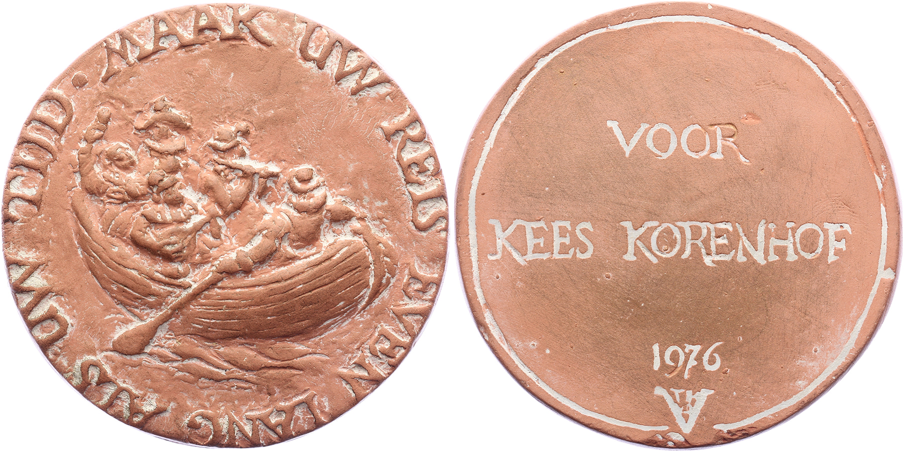 1976 Reispenning. Roeiboot met spelevarend gezelschap. / Inscriptieruimte. Op naam van Kees Korenhof (vriend Theo v.d. Vathorst). Keramiek 77. Vgl. De Beeldenaar 2003, pag. 222, nr. 11. Theo van de Vathorst. Mogelijk uniek? Prachtig.